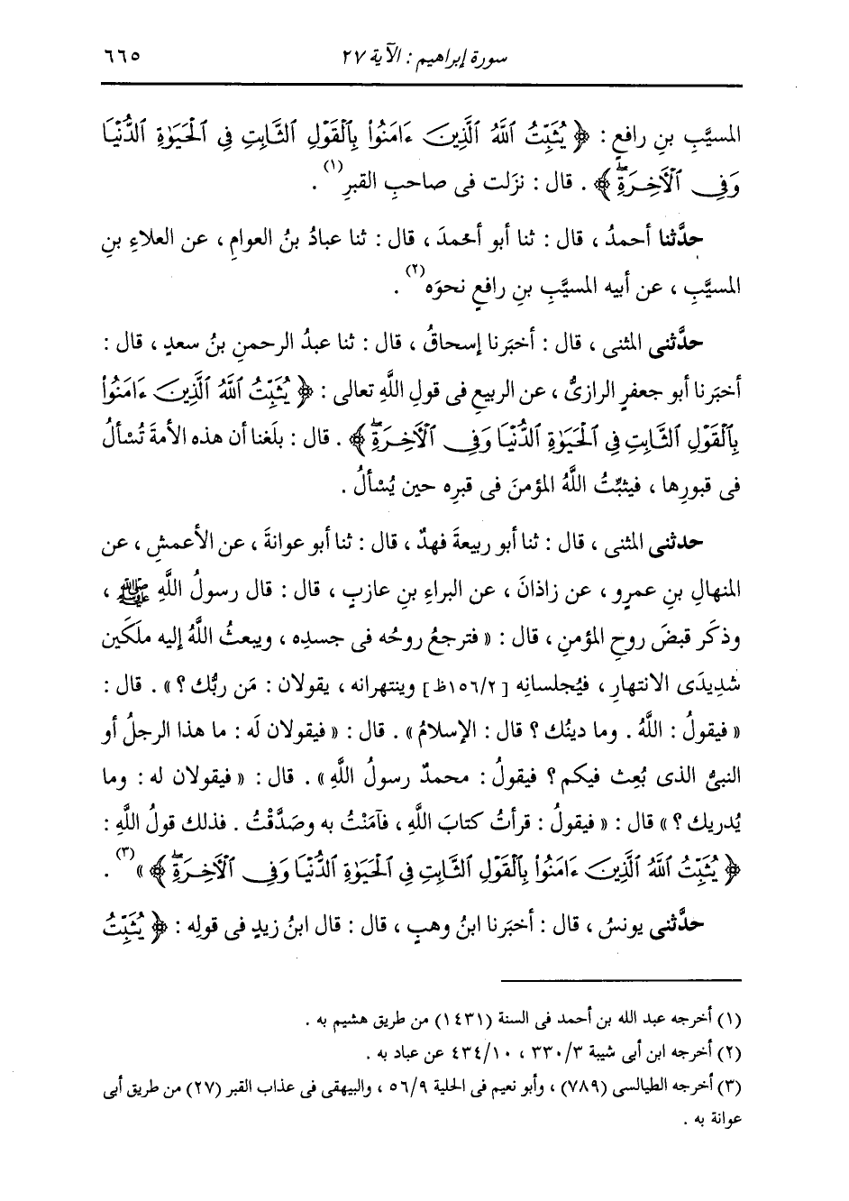حَدَّثَنِي الْمُثَنَّى قَالَ: ثنا أَبُو رَبِيعَةَ فَهِدٌ قَالَ: ثنا أَبُو عَوَانَةَ، عَنِ الْأَعْمَشِ، عَنِ الْمِنْهَالِ بْنِ عَمْرٍو، عَنْ زَاذَانَ، عَنِ الْبَرَاءِ بْنِ عَازِبٍ قَالَ: قَالَ رَسُولُ اللَّهِ صَلَّى اللهُ عَلَيْهِ وَسَلَّمَ، وَذَكَرَ قَبْضَ رُوحِ الْمُؤْمِنِ قَالَ: " §فَتَرْجِعُ رُوحُهُ فِي جَسَدِهِ، وَيَبْعَثُ اللَّهُ إِلَيْهِ مَلَكَيْنِ شَدِيدَيْ الِانْتِهَارِ، فَيُجْلِسَانِهِ وَيَنْتَهِرَانِهِ، يَقُولَانِ: مَنْ رَبُّكَ؟ قَالَ: فَيَقُولُ: اللَّهُ، وَمَا دِينُكَ؟ قَالَ: الْإِسْلَامُ، قَالَ: فَيَقُولَانِ لَهُ: مَا هَذَا الرَّجُلُ أَوِ النَّبِيُّ الَّذِي بُعِثَ فِيكُمْ؟ فَيَقُولُ مُحَمَّدٌ رَسُولُ اللَّهِ، قَالَ: فَيَقُولَانِ لَهُ: وَمَا يُدْرِيكَ؟ قَالَ: فَيَقُولُ: قَرَأْتُ كِتَابَ اللَّهِ فَآمَنْتُ بِهِ وَصَدَّقْتُ، فَذَلِكَ قَوْلُ اللَّهِ {يُثَبِّتُ اللَّهُ الَّذِينَ آمَنُوا بِالْقَوْلِ الثَّابِتِ فِي الْحَيَاةِ الدُّنْيَا وَفِي الْآخِرَةِ} [إبراهيم: 27] "