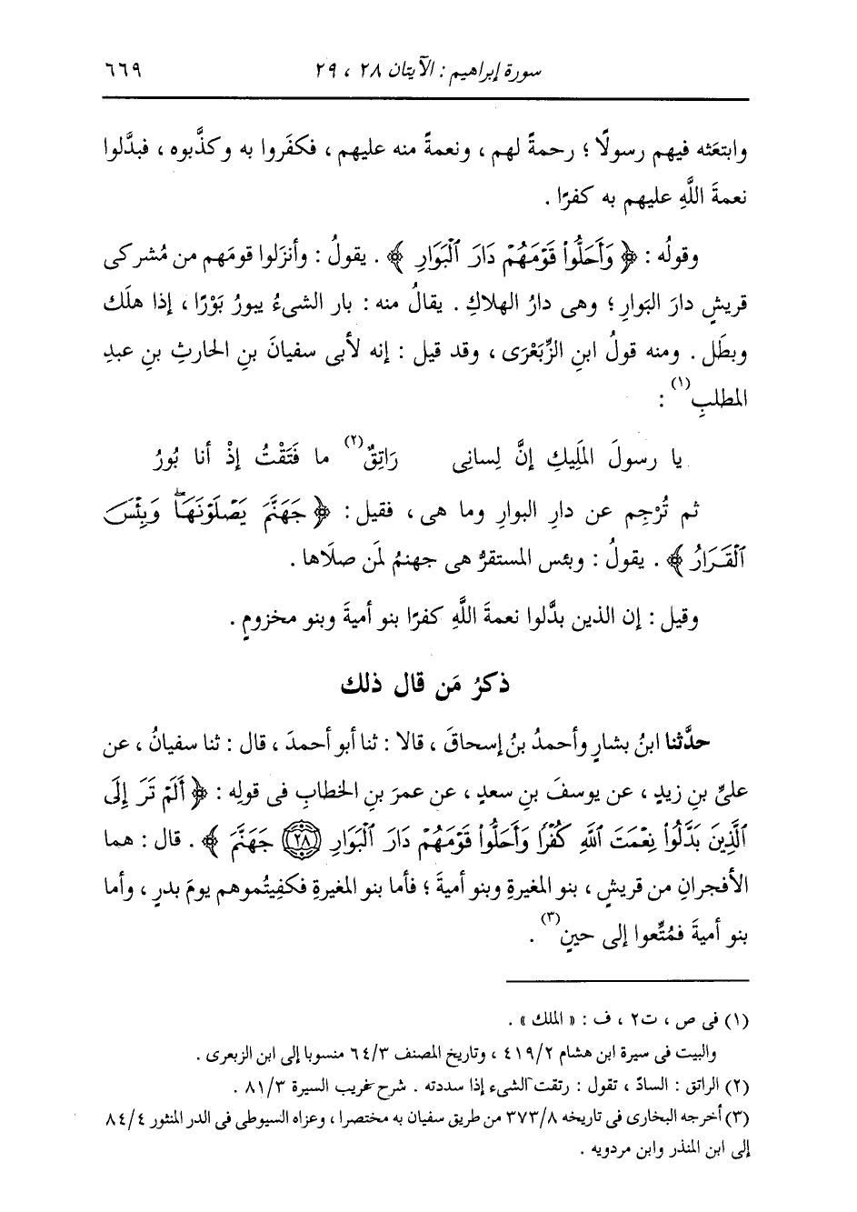 ذِكْرُ مَنْ قَالَ ذَلِكَ: حَدَّثَنَا ابْنُ بَشَّارٍ، وَأَحْمَدُ بْنُ إِسْحَاقَ، قَالَا: ثنا أَبُو أَحْمَدَ، قَالَ: ثنا سُفْيَانُ، عَنْ عَلِيِّ بْنِ زَيْدٍ، عَنْ يُوسُفَ بْنِ سَعْدٍ، عَنْ عُمَرَ بْنِ الْخَطَّابِ، فِي قَوْلِهِ: {§أَلَمْ تَرَ إِلَى الَّذِينَ بَدَّلُوا نِعْمَةَ اللَّهِ كُفْرًا وَأَحَلُّوا قَوْمَهُمْ دَارَ الْبَوَارِ. جَهَنَّمَ} [إبراهيم: 29] قَالَ: " هُمَا الْأَفْجَرَانِ مِنْ قُرَيْشٍ: بَنُو الْمُغِيرَةِ، وَبَنُو أُمَيَّةَ، فَأَمَّا بَنُو الْمُغِيرَةِ فَكَفَيْتُمُوهُمْ يَوْمَ بَدْرٍ، وَأَمَّا بَنُو أُمَيَّةَ فَمُتِّعُوا إِلَى حِينٍ "
