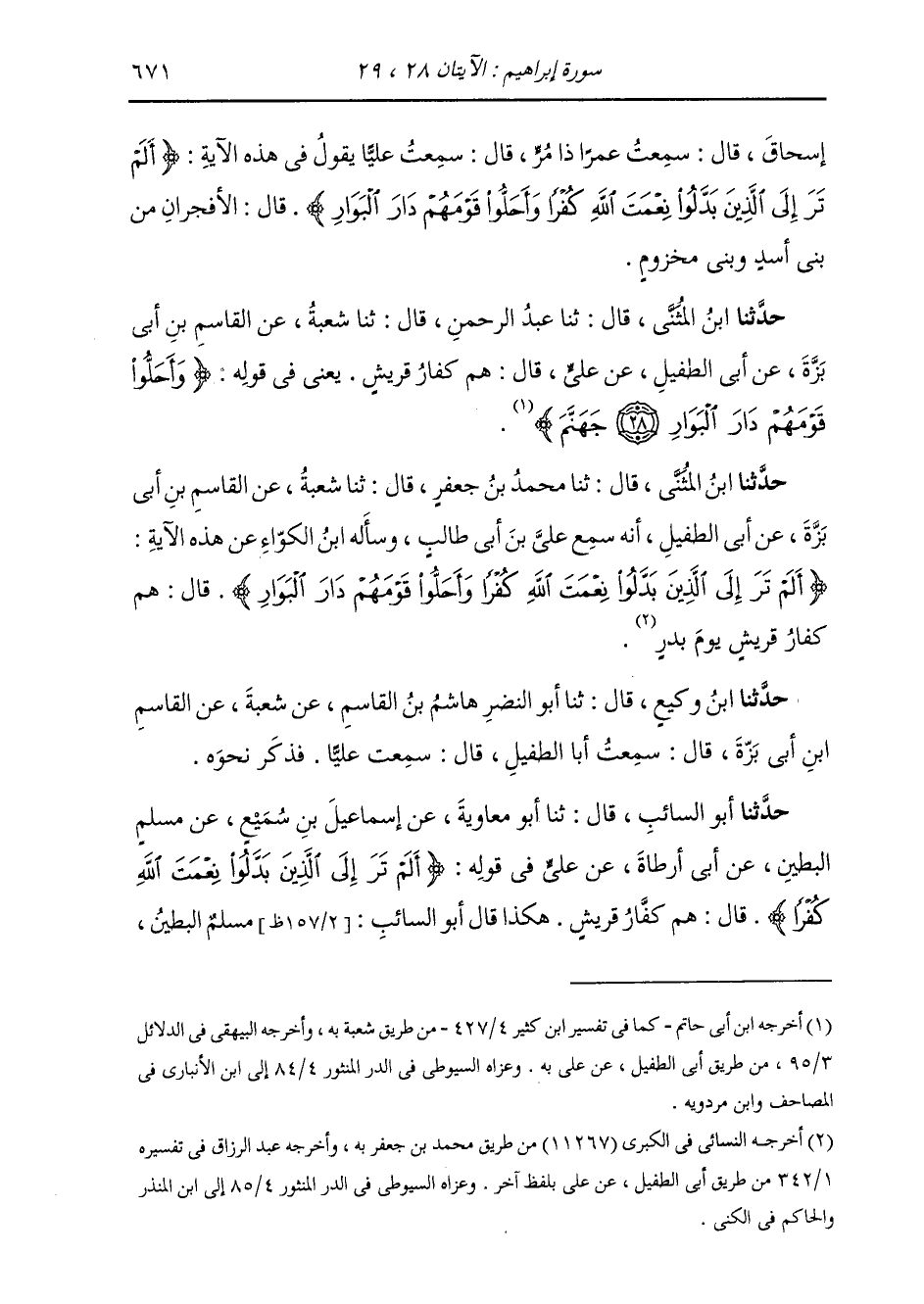 حَدَّثَنَا ابْنُ الْمُثَنَّى قَالَ: ثنا مُحَمَّدُ بْنُ جَعْفَرٍ قَالَ: ثنا شُعْبَةُ، عَنِ الْقَاسِمِ بْنِ أَبِي بَزَّةَ، عَنْ أَبِي الطُّفَيْلِ أَنَّهُ سَمِعَ عَلِيَّ بْنَ أَبِي طَالِبٍ، وَسَأَلَهُ ابْنُ الْكَوَّاءِ عَنْ هَذِهِ الْآيَةِ: {§أَلَمْ تَرَ إِلَى الَّذِينَ بَدَّلُوا نِعْمَةَ اللَّهِ كُفْرًا وَأَحَلُّوا قَوْمَهُمْ دَارَ الْبَوَارِ} [إبراهيم: 28] قَالَ: «هُمْ كُفَّارُ قُرَيْشٍ يَوْمَ بَدْرٍ» . حَدَّثَنَا ابْنُ وَكِيعٍ قَالَ: ثنا أَبُو النَّضْرِ هَاشِمُ بْنُ الْقَاسِمِ، عَنْ شُعْبَةَ، عَنِ الْقَاسِمِ بْنِ أَبِي بَزَّةَ قَالَ: " سَمِعْتُ أَبَا الطُّفَيْلِ قَالَ: سَمِعْتُ عَلِيًّا، فَذَكَرَ نَحْوَهُ