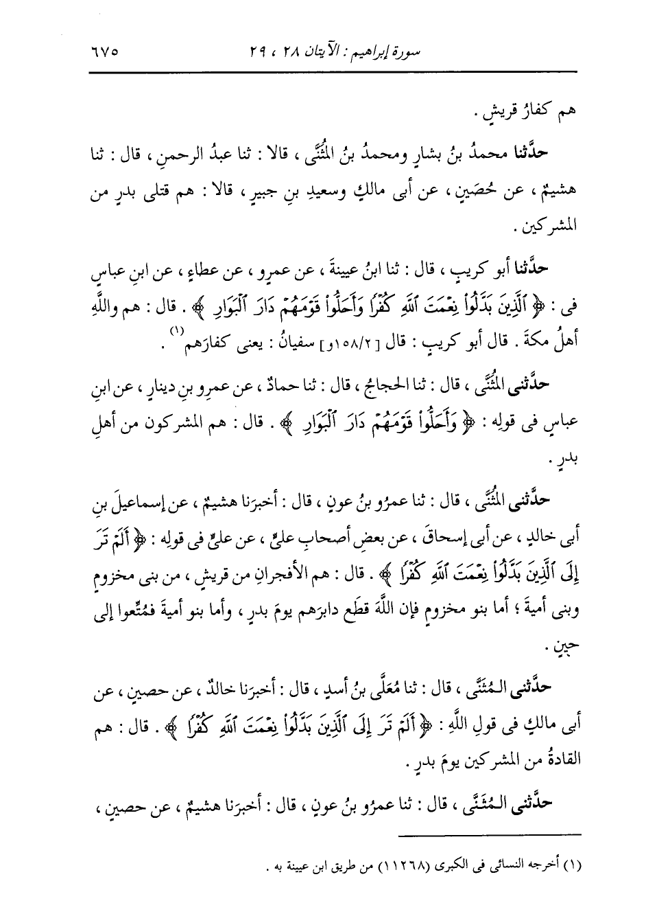 حَدَّثَنِي الْمُثَنَّى، قَالَ: ثنا مُعَلَّى بْنُ أَسَدٍ، قَالَ: أَخْبَرَنَا خَالِدٌ، عَنْ حُصَيْنٍ، عَنْ أَبِي مَالِكٍ، فِي قَوْلِ اللَّهِ: {§أَلَمْ تَرَ إِلَى الَّذِينَ بَدَّلُوا نِعْمَةَ اللَّهِ كُفْرًا} [إبراهيم: 28] قَالَ: «هُمُ الْقَادَةُ مِنَ الْمُشْرِكِينَ يَوْمَ بَدْرٍ»