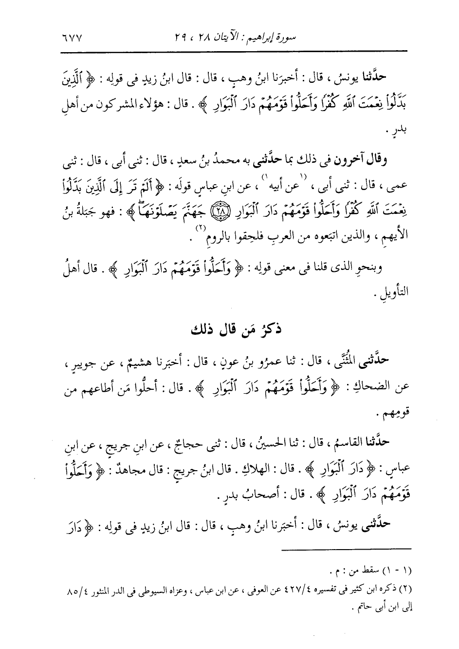 حَدَّثَنَا يُونُسُ، قَالَ: أَخْبَرَنَا ابْنُ وَهْبٍ، قَالَ: قَالَ ابْنُ زَيْدٍ فِي قَوْلِهِ: {§أَلَمْ تَرَ إِلَى الَّذِينَ بَدَّلُوا نِعْمَةَ اللَّهِ كُفْرًا وَأَحَلُّوا قَوْمَهُمْ دَارَ الْبَوَارِ} [إبراهيم: 28] قَالَ: «هَؤُلَاءِ الْمُشْرِكُونَ مِنْ أَهْلِ بَدْرٍ»