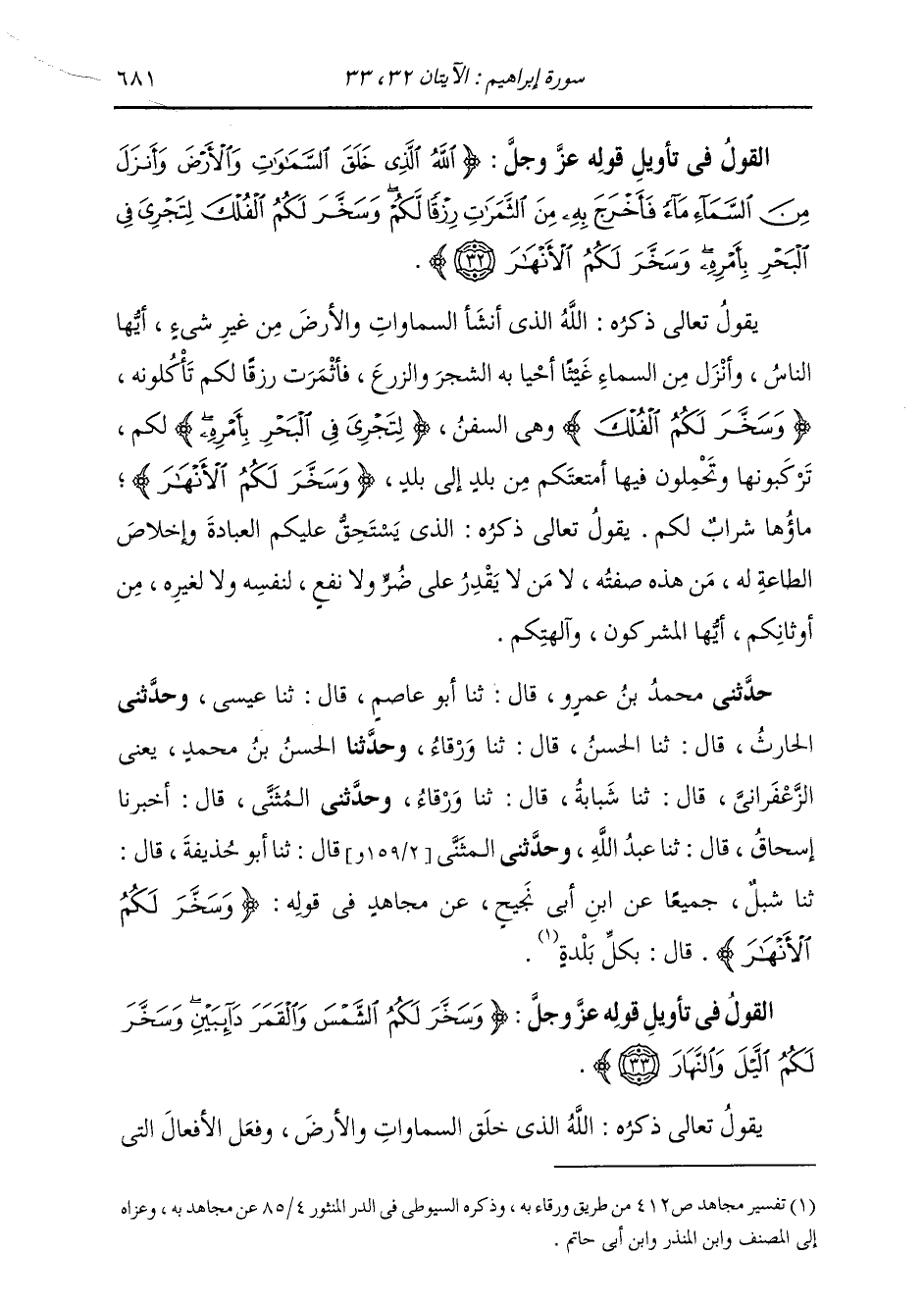 حَدَّثَنِي مُحَمَّدُ بْنُ عَمْرٍو، قَالَ: ثنا أَبُو عَاصِمٍ، قَالَ: ثنا عِيسَى، وَحَدَّثَنِي الْحَارِثُ، قَالَ: ثنا الْحَسَنُ، قَالَ: ثنا وَرْقَاءُ، وَحَدَّثَنَا الْحَسَنُ بْنُ مُحَمَّدٍ يَعْنِي الزَّعْفَرَانِيَّ، قَالَ: ثنا شَبَابَةُ، قَالَ: ثنا وَرْقَاءُ، وَحَدَّثَنِي الْمُثَنَّى، قَالَ: أَخْبَرَنَا إِسْحَاقُ، قَالَ: ثنا عَبْدُ اللَّهِ، وَحَدَّثَنِي الْمُثَنَّى، قَالَ: ثنا أَبُو حُذَيْفَةَ، قَالَ: ثنا شِبْلٌ، جَمِيعًا، عَنِ ابْنِ أَبِي نَجِيحٍ، عَنْ مُجَاهِدٍ، فِي قَوْلِهِ: {§وَسَخَّرَ لَكُمُ الْأَنْهَارَ} [إبراهيم: 32] قَالَ: «بِكُلِّ بَلْدَةٍ»