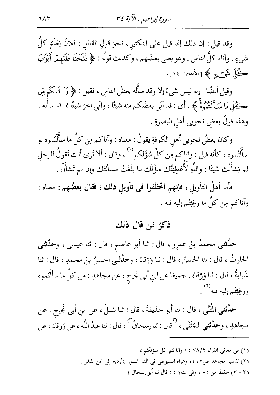 ذِكْرُ مَنْ قَالَ ذَلِكَ: حَدَّثَنِي مُحَمَّدُ بْنُ عَمْرٍو، قَالَ: ثنا أَبُو عَاصِمٍ، قَالَ: ثنا عِيسَى، وَحَدَّثَنِي الْحَارِثُ، قَالَ: ثنا الْحَسَنُ، قَالَ: ثنا وَرْقَاءُ، وَحَدَّثَنِي الْحَسَنُ بْنُ مُحَمَّدٍ، قَالَ: ثنا شَبَابَةُ، قَالَ: ثنا وَرْقَاءُ، جَمِيعًا، عَنِ ابْنِ أَبِي نَجِيحٍ، عَنْ مُجَاهِدٍ: {§مِنْ كُلِّ مَا سَأَلْتُمُوهُ} [إبراهيم: 34] وَرَغِبْتُمْ إِلَيْهِ فِيهِ. حَدَّثَنِي الْمُثَنَّى قَالَ: ثنا أَبُو حُذَيْفَةَ قَالَ: ثنا شِبْلٌ، عَنِ ابْنِ أَبِي نَجِيحٍ، عَنْ مُجَاهِدِ، وَحَدَّثَنِي الْمُثَنَّى قَالَ: ثنا عَبْدُ اللَّهِ، عَنْ وَرْقَاءَ، عَنِ -[684]- ابْنِ أَبِي نَجِيحٍ، عَنْ مُجَاهِدِ. وَحَدَّثَنَا الْقَاسِمُ قَالَ: ثنا الْحُسَيْنُ قَالَ: ثني حَجَّاجٌ، عَنِ ابْنِ جُرَيْجٍ، عَنْ مُجَاهِدٍ، مِثْلَهُ