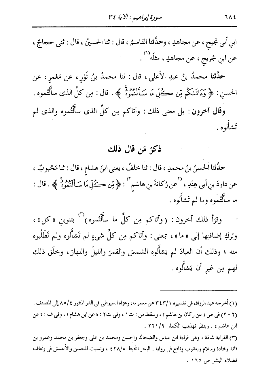 ذِكْرُ مَنْ قَالَ ذَلِكَ: حَدَّثَنَا الْحَسَنُ بْنُ مُحَمَّدٍ، قَالَ: ثنا خَلَفٌ يَعْنِي ابْنَ هِشَامٍ، قَالَ: ثنا مَحْبُوبٌ، عَنْ دَاوُدَ بْنِ أَبِي هِنْدٍ، عَنْ رُكَانَةَ بْنِ هَاشِمٍ: {§مِنْ كُلِّ مَا سَأَلْتُمُوهُ} [إبراهيم: 34] وَقَالَ: مَا سَأَلْتُمُوهُ وَمَا لَمْ تَسْأَلُوهُ ". وَقَرَأَ ذَلِكَ آخَرُونَ: (وَآتَاكُمْ مِنْ كُلٍّ مَا سَأَلْتُمُوهُ) بِتَنْوِينِ «كُلِّ» وَتَرْكِ إِضَافَتِهَا إِلَى «مَا» بِمَعْنَى: وَآتَاكُمْ مِنْ كُلِّ شَيْءٍ لَمْ تَسْأَلُوهُ وَلَمْ تَطْلُبُوهُ مِنْهُ، وَذَلِكَ أَنَّ الْعِبَادَ لَمْ يَسْأَلُوهُ الشَّمْسَ وَالْقَمَرَ، وَاللَّيْلَ وَالنَّهَارَ، وَخَلَقَ ذَلِكَ لَهُمْ مِنْ غَيْرِ أَنْ يَسْأَلُوهُ