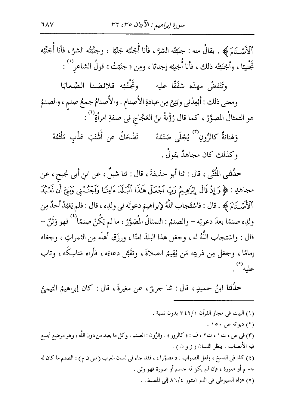 وَمَعْنَى ذَلِكَ: أَبْعِدْنِي وَبَنِيَّ مِنْ عِبَادَةِ الْأَصْنَامِ، وَالْأَصْنَامُ: جَمْعُ صَنَمٍ، وَالصَّنَمُ: هُوَ التِّمْثَالُ الْمُصَوَّرُ، كَمَا قَالَ رُؤْبَةُ بْنُ الْعَجَّاجِ فِي صِفَةِ امْرَأَةٍ: