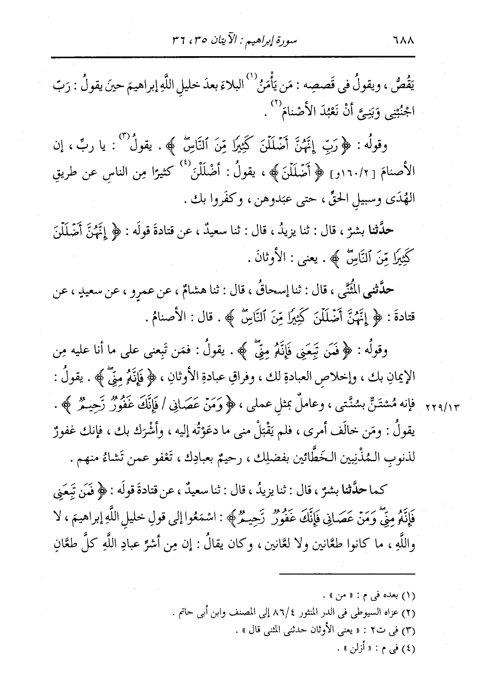 §وَقَوْلُهُ: {رَبِّ إِنَّهُنَّ أَضْلَلْنَ كَثِيرًا مِنَ النَّاسِ} [إبراهيم: 36] يَقُولُ: يَا رَبِّ إِنَّ الْأَصْنَامَ أَضْلَلْنَ: يَقُولُ: أَزَلَّنَّ كَثِيرًا مِنَ النَّاسِ عَنْ طَرِيقِ الْهُدَى وَسَبِيلِ الْحَقِّ حَتَّى عَبْدُوهُنَّ، وَكَفَرُوا بِكَ