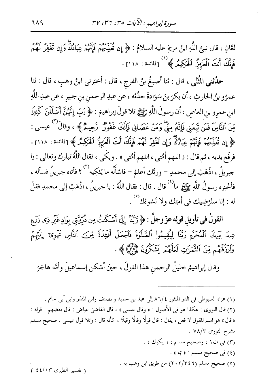 حَدَّثَنِي الْمُثَنَّى، قَالَ: ثنا أَصْبَغُ بْنُ الْفَرَجِ، قَالَ: أَخْبَرَنِي ابْنُ وَهْبٍ، قَالَ: ثنا عَمْرُو بْنُ الْحَارِثِ، أَنَّ بَكْرَ بْنَ سَوَادَةَ حَدَّثَهُ عَنْ عَبْدِ الرَّحْمَنِ بْنِ جُبَيْرٍ، عَنْ عَبْدِ اللَّهِ بْنِ عَمْرِو بْنِ الْعَاصِ: أَنَّ رَسُولَ اللَّهِ صَلَّى اللهُ عَلَيْهِ وَسَلَّمَ تَلَا قَوْلَ إِبْرَاهِيمَ: {رَبِّ إِنَّهُنَّ أَضْلَلْنَ كَثِيرًا مِنَ النَّاسِ، فَمَنْ تَبِعَنِي فَإِنَّهُ مِنِّي، وَمَنْ عَصَانِي فَإِنَّكَ غَفُورٌ رَحِيمٌ} [إبراهيم: 36] وَقَالَ عِيسَى: {إِنْ تُعَذِّبْهُمْ فَإِنَّهُمْ عِبَادُكَ، وَإِنْ تَغْفِرْ لَهُمْ فَإِنَّكَ أَنْتَ الْعَزِيزُ الْحَكِيمُ} [المائدة: 118] فَرَفَعَ يَدَيْهِ ثُمَّ قَالَ: «اللَّهُمَّ أُمَّتِي، اللَّهُمَّ أُمَّتِي» وَبَكَى، فَقَالَ اللَّهُ تَعَالَى: يَا جَبْرَئِيلُ، اذْهَبْ إِلَى مُحَمَّدٍ وَرَبُّكَ أَعْلَمُ فَاسْأَلْهُ مَا يُبْكِيهِ؟ فَأَتَاهُ جَبْرَئِيلُ فَسَأَلَهُ، فَأَخْبَرَهُ رَسُولُ اللَّهِ صَلَّى اللهُ عَلَيْهِ وَسَلَّمَ مَا قَالَ قَالَ: فَقَالَ اللَّهُ: يَا جَبْرَئِيلُ اذْهَبْ إِلَى مُحَمَّدٍ وَقُلْ لَهُ: §إِنَّا سَنُرْضِيكَ فِي أُمَّتِكَ وَلَا نَسُوءُكَ "