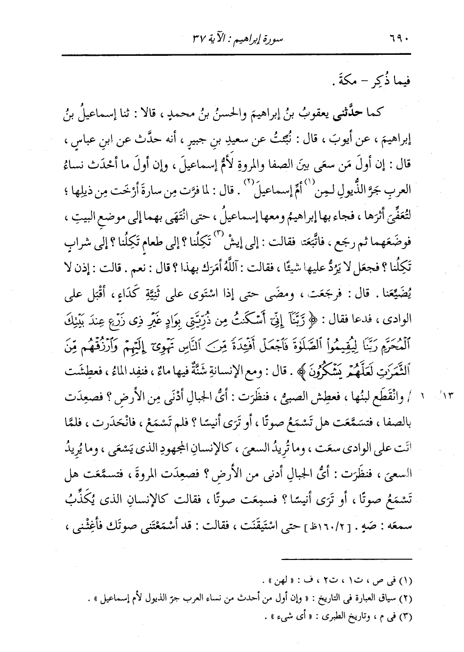 حَدَّثَنِي يَعْقُوبُ بْنُ إِبْرَاهِيمَ، وَالْحَسَنُ بْنُ مُحَمَّدٍ، قَالَا: ثنا إِسْمَاعِيلُ بْنُ إِبْرَاهِيمَ، عَنْ أَيُّوبَ، قَالَ: نُبِّئْتُ عَنْ سَعِيدِ بْنِ جُبَيْرٍ، أَنَّهُ حَدَّثَ عَنِ ابْنِ عَبَّاسٍ، قَالَ: " إِنَّ أَوَّلَ مَنْ سَعَى بَيْنَ الصَّفَا وَالْمَرْوَةِ لَأُمُّ إِسْمَاعِيلَ، وَإِنَّ أَوَّلَ مَا أَحْدَثَ نِسَاءُ الْعَرَبِ جَرُّ الذُّيُولِ لَمِنْ أُمِّ إِسْمَاعِيلَ قَالَ: لَمَّا فَرَّتْ مِنْ سَارَةَ أَرْخَتْ مِنْ ذَيْلِهَا لِتُعَفِّيَ أَثَرَهَا، فَجَاءَ بِهَا إِبْرَاهِيمُ وَمَعَهَا إِسْمَاعِيلُ حَتَّى انْتَهَى بِهِمَا إِلَى مَوْضِعِ الْبَيْتِ، فَوَضَعَهُمَا ثُمَّ رَجَعَ، فَاتَّبَعَتْهُ، فَقَالَتْ: إِلَى أَيِ شَيْءٍ تَكِلُنَا؟ إِلَى طَعَامٍ تَكِلُنَا؟ إِلَى شَرَابٍ تَكِلُنَا؟ فَجَعَلَ لَا يَرُدُّ عَلَيْهَا شَيْئًا، فَقَالَتِ: اللَّهُ أَمَرَكَ بِهَذَا؟ قَالَ: نَعَمْ، قَالَتْ: إِذَنْ لَا يُضَيِّعُنَا قَالَ: فَرَجَعَتْ وَمَضَى حَتَّى إِذَا اسْتَوَى عَلَى ثَنِيَّةِ كَدَاءٍ، أَقْبَلَ عَلَى الْوَادِي فَدَعَا، فَقَالَ: {رَبَّنَا إِنِّي أَسْكَنْتُ مِنْ ذُرِّيَّتِي بِوَادٍ غَيْرِ ذِي زَرْعٍ عِنْدَ بَيْتِكِ الْمُحَرَّمِ، رَبَّنَا لِيُقِيمُوا الصَّلَاةَ، فَاجْعَلْ أَفْئِدَةً مِنَ النَّاسِ تَهْوِي إِلَيْهِمْ، وَارْزُقْهُمْ مِنَ الثَّمَرَاتِ لَعَلَّهُمْ يَشْكُرُونَ} [إبراهيم: 37] قَالَ: " وَمَعَ الْإِنْسَانَةِ شَنَّةٌ فِيهَا مَاءٌ فَنَفِدَ الْمَاءُ فَعَطَشَتْ وَانْقَطَعَ لَبَنُهَا، فَعَطِشَ الصَّبِيُّ، فَنَظَرَتْ أَيَّ الْجِبَالِ أَدْنَى مِنَ الْأَرْضِ، فَصَعِدَتْ بِالصَّفَا، فَتَسَمَّعَتْ هَلْ تَسْمَعُ صَوْتًا أَوْ تَرَى أَنِيسًا، فَلَمْ تَسْمَعْ، فَانْحَدَرَتْ، فَلَمَّا أَتَتْ عَلَى الْوَادِي سَعَتْ وَمَا تُرِيدُ السَّعْيَ، كَالْإِنْسَانِ الْمَجْهُودِ الَّذِي يَسْعَى وَمَا يُرِيدُ السَّعْيَ، فَنَظَرَتْ أَيَّ الْجِبَالِ أَدْنَى مِنَ الْأَرْضِ، فَصَعِدْتِ الْمَرْوَةَ فَتَسَمَّعَتْ هَلْ تَسْمَعْ صَوْتًا، أَوْ تَرَى أَنِيسًا، فَسَمِعَتْ صَوْتًا، فَقَالَتْ كَالْإِنْسَانِ الَّذِي يُكَذِّبُ سَمْعَهُ: صَهٍ حَتَّى اسْتَيْقَنَتْ، فَقَالَتْ: قَدْ أَسْمَعْتَنِي صَوْتَكَ فَأَغِثْنِي، -[691]- فَقَدْ هَلَكْتُ وَهَلَكَ مَنْ مَعِي فَجَاءَ الْمَلَكُ فَجَاءَ بِهَا حَتَّى انْتَهَى بِهَا إِلَى مَوْضِعِ زَمْزَمَ، فَضَرَبَ بِقَدَمِهِ فَفَارَتْ عَيْنًا، فَعَجَّلَتِ الْإِنْسَانَةُ فَجَعَلَتْ فِي شَنَّتِهَا، فَقَالَ رَسُولُ اللَّهِ صَلَّى اللهُ عَلَيْهِ وَسَلَّمَ: «§رَحِمَ اللَّهُ أُمَّ إِسْمَاعِيلَ لَوْلَا أَنَّهَا عَجِلَتْ لَكَانَتْ زَمْزَمُ عَيْنًا مَعِينًا» . وَقَالَ لَهَا الْمَلَكُ: لَا تَخَافِي الظَّمَأَ عَلَى أَهْلِ هَذَا الْبَلَدِ، فَإِنَّمَا هِيَ عَيْنٌ لِشُرْبِ ضِيفَانِ اللَّهِ، وَقَالَ: إِنَّ أَبَا هَذَا الْغُلَامِ سَيَجِيءُ، فَيَبْنِيَانِ للَّهِ بَيْتًا هَذَا مَوْضِعُهُ. قَالَ: وَمَرَّتْ رُفْقَةٌ مِنْ جُرْهُمَ تُرِيدُ الشَّامَ، فَرَأَوُا الطَّيْرَ عَلَى الْجَبَلِ، فَقَالُوا: إِنَّ هَذَا الطَّيْرَ لَعَائِفٌ عَلَى مَاءٍ، فَهَلْ عَلِمْتُمْ بِهَذَا الْوَادِي مِنْ مَاءٍ؟ فَقَالُوا: لَا، فَأَشْرَفُوا فَإِذَا هُمْ بِالْإِنْسَانَةِ، فَأْتَوْهَا فَطَلَبُوا إِلَيْهَا أَنْ يَنْزِلُوا مَعَهَا، فَأَذِنَتْ لَهُمْ. قَالَ: وَأَتَى عَلَيْهَا مَا يَأْتِي عَلَى هَؤُلَاءِ النَّاسِ مِنَ الْمَوْتِ، فَمَاتَتْ، وَتَزَوَّجَ إِسْمَاعِيلُ امْرَأَةً مِنْهُمْ، فَجَاءَ إِبْرَاهِيمُ فَسَأَلَ عَنْ مَنْزِلِ إِسْمَاعِيلَ حَتَّى دُلَّ عَلَيْهِ، فَلَمْ يَجِدْهُ، وَوَجَدَ امْرَأَةً لَهُ فَظَّةً غَلِيظَةً، فَقَالَ لَهَا: إِذَا جَاءَ زَوْجُكِ فَقُولِي لَهُ: جَاءَ هَهُنَا شَيْخٌ مِنْ صِفَتِهِ كَ
