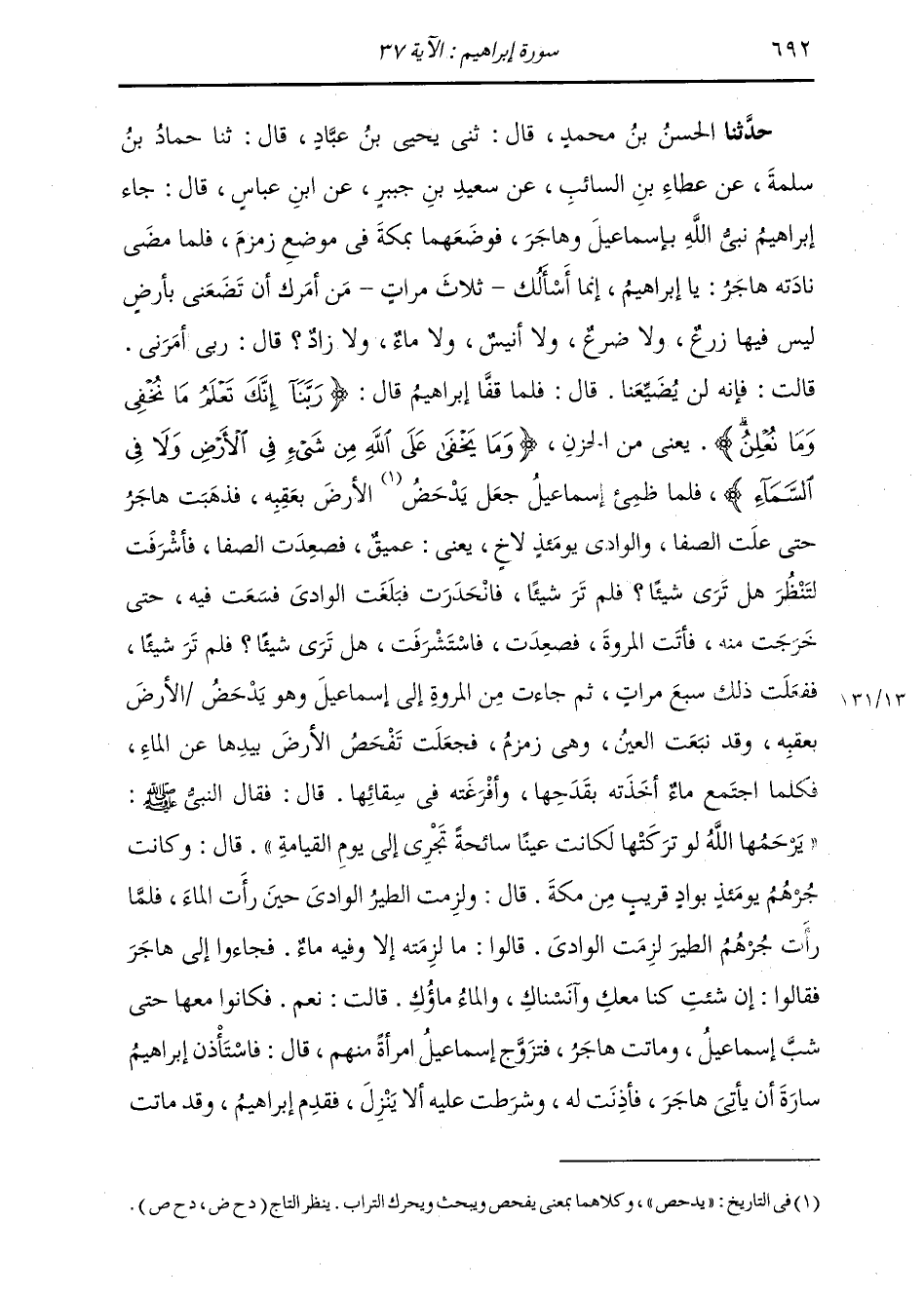 حَدَّثَنَا الْحَسَنُ بْنُ مُحَمَّدٍ قَالَ: ثني يَحْيَى بْنُ عَبَّادٍ قَالَ: ثنا حَمَّادُ بْنُ سَلَمَةَ، عَنْ عَطَاءِ بْنِ السَّائِبِ، عَنْ سَعِيدِ بْنِ جُبَيْرٍ، عَنِ ابْنِ عَبَّاسٍ قَالَ: " جَاءَ نَبِيُّ اللَّهِ إِبْرَاهِيمُ بِإِسْمَاعِيلَ وَهَاجَرَ، فَوَضَعَهُمَا بِمَكَّةَ فِي مَوْضِعِ زَمْزَمَ، فَلَمَّا مَضَى نَادَتْهُ هَاجَرُ: يَا إِبْرَاهِيمُ، إِنَّمَا أَسْأَلُكَ ثَلَاثَ مَرَّاتٍ: مَنْ أَمَرَكَ أَنْ تَضَعَنِيَ بِأَرْضٍ لَيْسَ فِيهَا ضَرْعٌ، وَلَا زَرْعٌ، وَلَا أَنِيسٌ، وَلَا زَادٌ، وَلَا مَاءٌ؟ قَالَ: رَبِّي أَمَرَنِي، قَالَتْ: فَإِنَّهُ لَنْ يُضَيِّعَنَا. قَالَ: فَلَمَّا قَفَّا إِبْرَاهِيمُ قَالَ: {رَبَّنَا إِنَّكَ تَعْلَمُ مَا نُخْفِي وَمَا نُعْلِنُ} [إبراهيم: 38] يَعْنِي مِنَ الْحُزْنِ {وَمَا يَخْفَى عَلَى اللَّهِ مِنْ شَيْءٍ فِي الْأَرْضِ وَلَا فِي السَّمَاءِ} [إبراهيم: 38] فَلَمَّا ظَمِئَ إِسْمَاعِيلُ جَعَلَ يَدْحَضُ الْأَرْضَ بِعَقِبِهِ، فَذَهَبَتْ هَاجَرُ حَتَّى عَلَتِ الصَّفَا، وَالْوَادِي يَوْمَئِذٍ لَاخٍ، يَعْنِي عَمِيقٌ، فَصَعِدَتِ الصَّفَا، فَأَشْرَفَتْ لِتَنْظُرَ هَلْ تَرَى شَيْئًا، فَلَمْ تَرَ شَيْئًا، فَانْحَدَرَتْ فَبَلَغَتِ الْوَادِي، فَسَعَتْ فِيهِ حَتَّى خَرَجَتْ مِنْهُ، فَأَتَتِ الْمَرْوَةَ، فَصَعِدَتْ، فَاسْتَشْرَفَتْ هَلْ تَرَ شَيْئًا، فَلَمْ تَرَ شَيْئًا، فَفَعَلَتْ ذَلِكَ سَبْعَ مَرَّاتٍ، ثُمَّ جَاءَتْ مِنَ الْمَرْوَةِ إِلَى إِسْمَاعِيلَ، وَهُوَ يَدْحَضُ الْأَرْضَ بِقَعْبِهِ، وَقَدْ نَبَعَتِ الْعَيْنُ وَهِيَ زَمْزَمُ فَجَعَلَتْ تَفْحَصُ الْأَرْضَ بِيَدِهَا عَنِ الْمَاءِ، فَكُلَّمَا اجْتَمَعَ مَاءٌ أَخَذَتْهُ بِقَدَحِهَا، وَأَفْرَغَتْهُ فِي سِقَائِهَا. قَالَ: فَقَالَ النَّبِيُّ صَلَّى اللهُ عَلَيْهِ وَسَلَّمَ: «§يَرْحَمُهَا اللَّهُ، لَوْ تَرَكَتْهَا لَكَانَتْ عَيْنًا سَائِحَةً تَجْرِي إِلَى يَوْمِ الْقِيَامَةِ» . قَالَ: وَكَانَتْ جُرْهُمُ يَوْمَئِذٍ بِوَادٍ قَرِيبٍ مِنْ مَكَّةَ، قَالَ: وَلَزِمَتِ الطَّيْرُ الْوَادِي حِينَ رَأَتِ الْمَاءَ، فَلَمَّا رَأَتْ جُرْهُمُ الطَّيْرَ لَزِمَتِ الْوَادِي، قَالُوا: مَا لَزِمَتْهُ إِلَّا وَفِيهِ مَاءٌ، فَجَاءُوا إِلَى هَاجَرَ، فَقَالُوا: إِنْ شِئْتِ كُنَّا مَعَكِ وَآنَسْنَاكِ وَالْمَاءُ مَاؤُكِ، قَالَتْ: نَعَمْ. فَكَانُوا مَعَهَا حَتَّى شَبَّ إِسْمَاعِيلُ، وَمَاتَتْ هَاجَرُ فَتَزَوَّجَ إِسْمَاعِيلُ امْرَأَةً مِنْهُمْ، قَالَ: فَاسْتَأْذَنَ إِبْرَاهِيمُ سَارَةَ أَنْ يَأْتِيَ هَاجَرَ فَأَذِنَتْ لَهُ، وَشَرَطَتْ عَلَيْهِ أَنْ لَا يَنْزِلَ، فَقَدِمَ إِبْرَاهِيمُ وَقَدْ مَاتَتْ -[693]- هَاجَرُ، فَذَهَبَ إِلَى بَيْتِ إِسْمَاعِيلَ، فَقَالَ لِامْرَأَتِهِ: أَيْنَ صَاحِبُكِ؟ قَالَتْ: لَيْسَ هَهُنَا، ذَهَبَ يَتَصَيَّدُ، وَكَانَ إِسْمَاعِيلُ يَخْرُجُ مِنَ الْحَرَمِ فَيَتَصَيَّدُ ثُمَّ يَرْجِعُ، فَقَالَ إِبْرَاهِيمُ: هَلْ عِنْدَكَ ضِيَافَةٌ، هَلْ عِنْدَكَ طَعَامٌ أَوْ شَرَابٌ؟ قَالَتْ: لَيْسَ عِنْدِي، وَمَا عِنْدِي أَحَدٌ. فَقَالَ إِبْرَاهِيمُ: إِذَا جَاءَ زَوْجُكِ فَأَقْرِئِيهِ السَّلَامَ وَقُولِي لَهُ: فَلْيُغَيِّرْ عَتَبَةَ بَابِهِ وَذَهَبَ إِبْرَاهِيمُ، وَجَاءَ إِسْمَاعِيلُ، فَوَجَدَ رِيحَ أَبِيهِ، فَقَالَ لِامْرَأَتِهِ: هَلْ جَاءَكِ أَحَدٌ؟ فَقَالَتْ: جَاءَنِي شَيْخٌ كَذَا وَكَذَا، كَالْمُسْتَخِفَّةِ بِشَأْنِهِ، قَالَ: فَمَا قَالَ لَكِ؟ قَالَتْ: قَالَ لِي: أَقْرِئِي زَوْجَكِ السَّلَامَ وَقُولِي لَهُ: فَلْيُغَيِّرْ عَتَبَةَ بَابِهِ، فَطَلَّقَهَا وَتَزَوَّجَ أُخْرَى، فَلَبِثَ إِبْرَاهِيمُ مَا شَاءَ اللَّهُ أَنْ يَلْبَثَ، ثُمَّ اسْتَأْذَنَ سَارَةَ أَنْ يَزُورَ إِسْمَاعِيلَ، فَأَذِنَتْ لَهُ، وَشَرَطَتْ عَ