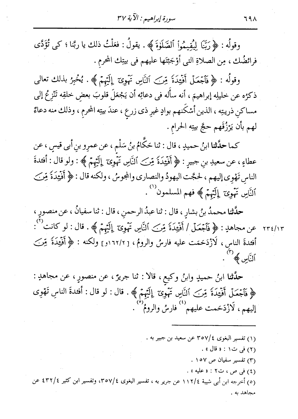 حَدَّثَنَا ابْنُ حُمَيْدٍ، قَالَ: ثنا حَكَّامُ بْنُ سَلْمٍ، عَنْ عَمْرِو بْنِ أَبِي قَيْسٍ، عَنْ عَطَاءٍ، عَنْ سَعِيدِ بْنِ جُبَيْرٍ: {§أَفْئِدَةً مِنَ النَّاسِ تَهْوِي إِلَيْهِمْ} [إبراهيم: 37] ، " وَلَوْ قَالَ: «أَفْئِدَةُ النَّاسِ تَهْوِي إِلَيْهِمْ» لَحَجَّتِ الْيَهُودُ وَالنَّصَارَى وَالْمَجُوسُ، وَلَكِنَّهُ قَالَ: {أَفْئِدَةً مِنَ النَّاسِ تَهْوِي إِلَيْهِمْ} [إبراهيم: 37] فَهُمُ الْمُسْلِمُونَ "