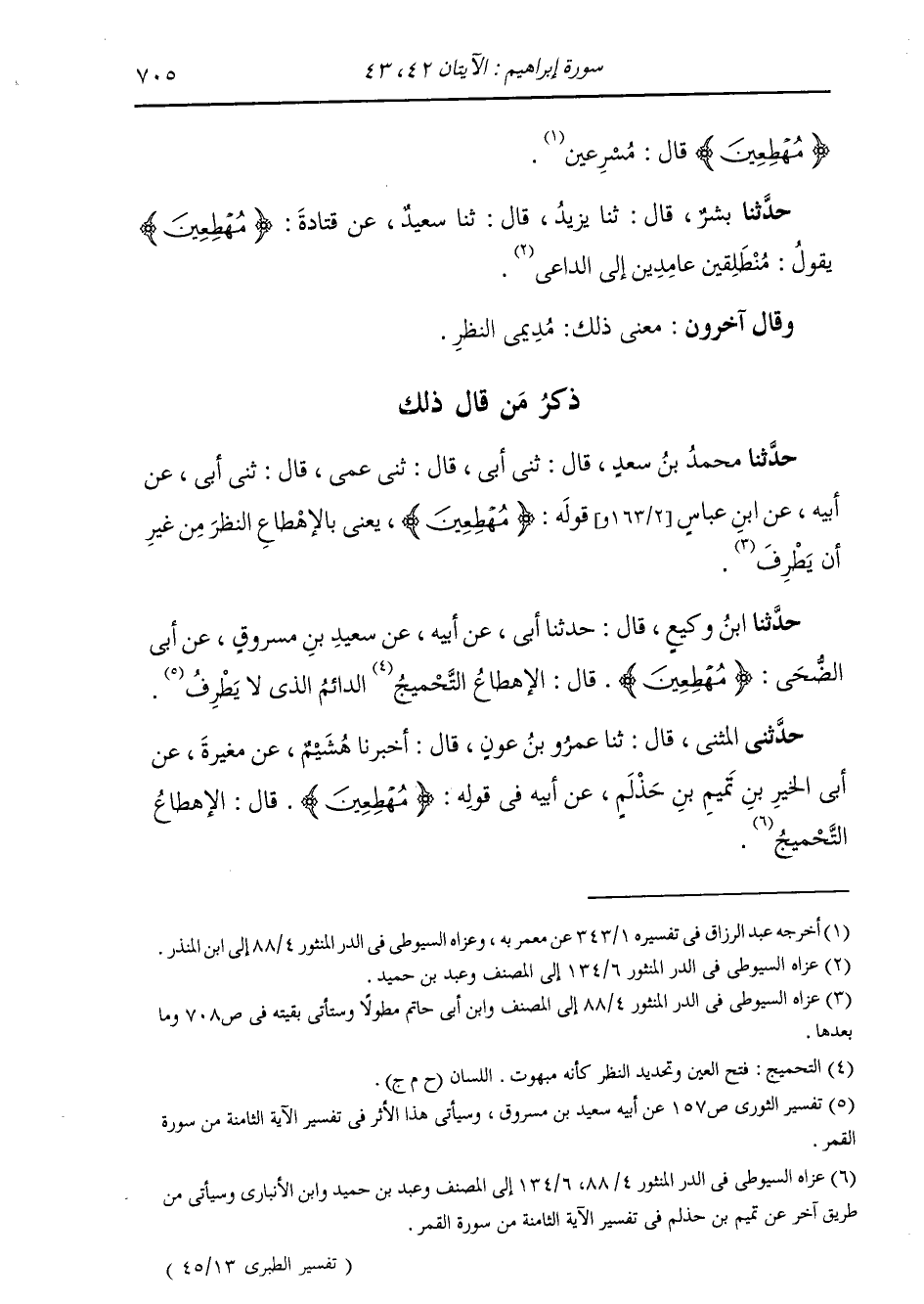 ذِكْرُ مَنْ قَالَ ذَلِكَ: حَدَّثَنَا مُحَمَّدُ بْنُ سَعْدٍ، قَالَ: ثني أَبِي قَالَ: ثني عَمِّي قَالَ: ثَنى أَبِي، عَنْ أَبِيهِ، عَنِ ابْنِ عَبَّاسٍ، قَوْلُهُ: {§مُهْطِعِينَ} [إبراهيم: 43] يَعْنِي بِالْإِهْطَاعِ: النَّظَرُ مِنْ غَيْرِ أَنْ يَطْرِفَ "