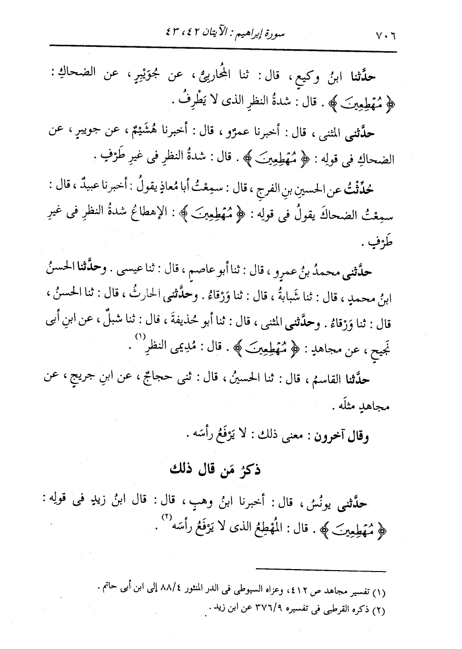 حَدَّثَنِي الْمُثَنَّى قَالَ: أَخْبَرَنَا عَمْرٌو قَالَ: أَخْبَرَنَا هُشَيْمٌ، عَنْ جُوَيْبِرٍ، عَنِ الضَّحَّاكِ، فِي قَوْلِهِ: {§مُهْطِعِينَ} [إبراهيم: 43] قَالَ: «شِدَّةُ النَّظَرِ فِي غَيْرِ طَرْفٍ»