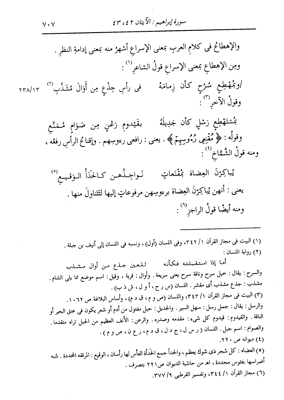 §وَقَوْلُهُ: {مُقْنِعِي رُءُوسِهِمْ} [إبراهيم: 43] يَعْنِي رَافِعِي رُءُوسِهِمْ وَإِقْنَاعِ الرَّأْسِ: رَفْعُهُ، وَمِنْهُ قَوْلُ الشَّمَّاخِ: