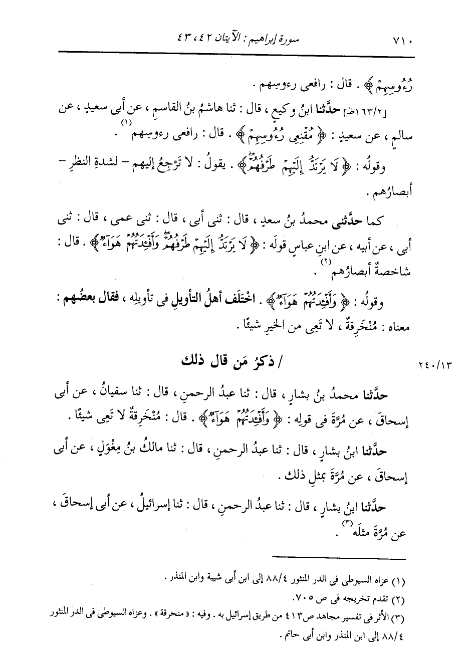 ذِكْرُ مَنْ قَالَ ذَلِكَ: حَدَّثَنَا مُحَمَّدُ بْنُ بَشَّارٍ، قَالَ: ثنا عَبْدُ الرَّحْمَنِ، قَالَ: ثنا سُفْيَانُ، عَنْ أَبِي إِسْحَاقَ، عَنْ مُرَّةَ، فِي قَوْلِهِ: {§وَأَفْئِدَتُهُمْ هَوَاءٌ} [إبراهيم: 43] قَالَ: «مُتَخَرِّقَةٌ لَا تَعِي شَيْئًا» . حَدَّثَنَا ابْنُ بَشَّارٍ قَالَ: ثنا عَبْدُ الرَّحْمَنِ قَالَ: ثنا مَالِكُ بْنُ مِغْوَلٍ، عَنْ أَبِي إِسْحَاقَ، عَنْ مُرَّةَ، بِمِثْلِ ذَلِكَ. حَدَّثَنَا ابْنُ بَشَّارٍ قَالَ: ثنا عَبْدُ الرَّحْمَنِ قَالَ: ثنا إِسْرَائِيلُ، عَنْ أَبِي إِسْحَاقَ، عَنْ مُرَّةَ، مِثْلَهُ. -[711]- حَدَّثَنَا مُحَمَّدُ بْنُ عُمَارَةَ قَالَ: ثنا سَهْلُ بْنُ عَامِرٍ قَالَ: ثنا مَالِكٌ وَإِسْرَائِيلُ، عَنْ أَبِي إِسْحَاقَ، عَنْ مُرَّةَ، مِثْلَهُ