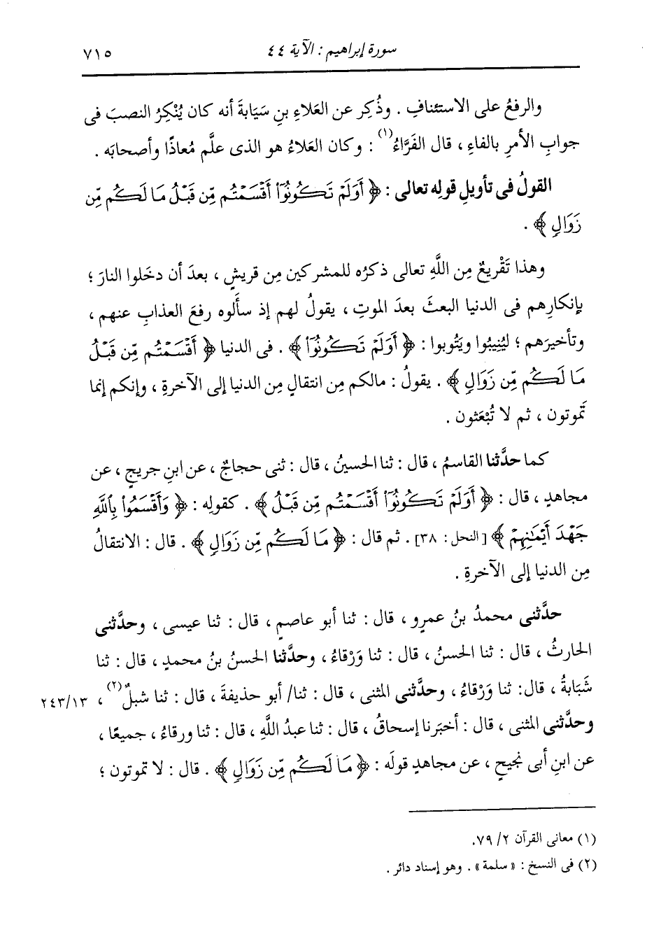 حَدَّثَنِي مُحَمَّدُ بْنُ عَمْرٍو، قَالَ: ثنا أَبُو عَاصِمٍ، قَالَ: ثنا عِيسَى، وَحَدَّثَنِي الْحَرْثُ، قَالَ: ثنا الْحَسَنُ، قَالَ: ثنا وَرْقَاءُ، وَحَدَّثَنَا الْحَسَنُ بْنُ مُحَمَّدٍ، قَالَ: ثنا شَبَابَةُ، قَالَ: ثنا وَرْقَاءُ، وَحَدَّثَنِي الْمُثَنَّى، قَالَ: ثنا أَبُو حُذَيْفَةَ، قَالَ: ثنا سَلَمَةُ، وَحَدَّثَنِي الْمُثَنَّى، قَالَ: أَخْبَرَنَا إِسْحَاقُ، قَالَ: ثنا عَبْدُ اللَّهِ، قَالَ: ثنا وَرْقَاءُ جَمِيعًا، عَنِ ابْنِ أَبِي نَجِيحٍ، عَنْ مُجَاهِدٍ، قَوْلُهُ: {§مَا لَكُمْ مِنْ زَوَالٍ} [إبراهيم: 44] قَالَ: «لَا تَمُوتُونَ، -[716]- لِقُرَيْشٍ»