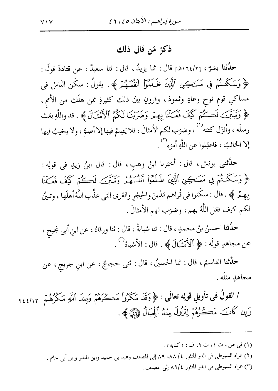 حَدَّثَنِي يُونُسُ، قَالَ: أَخْبَرَنَا ابْنُ وَهْبٍ، قَالَ: قَالَ ابْنُ زَيْدٍ فِي قَوْلِهِ: {§وَسَكَنْتُمْ فِي مَسَاكِنِ الَّذِينَ ظَلَمُوا أَنْفُسَهُمْ، وَتَبَيَّنَ لَكُمْ كَيْفَ فَعَلْنَا بِهِمْ} [إبراهيم: 45] قَالَ: «سَكَنُوا فِي قُرَاهُمْ مَدْيَنَ وَالْحِجْرَ وَالْقُرَى الَّتِي عَذَّبَ اللَّهُ أَهْلَهَا، وَتَبَيَّنَ لَكُمْ كَيْفَ فَعَلَ اللَّهُ بِهِمْ، وَضَرَبَ لَهُمُ الْأَمْثَالَ»