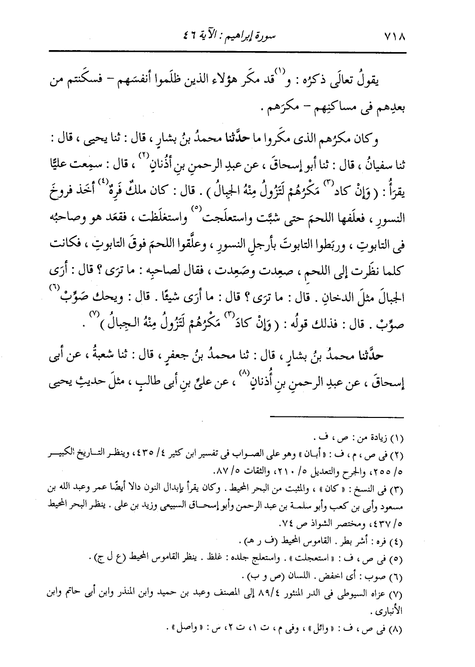 حَدَّثَنَا مُحَمَّدُ بْنُ بَشَّارٍ، قَالَ: ثنا يَحْيَى، قَالَ: ثنا سُفْيَانُ، قَالَ: ثنا أَبُو إِسْحَاقَ، عَنْ عَبْدِ الرَّحْمَنِ بْنِ أَبَانَ، قَالَ: سَمِعْتُ عَلِيًّا، يَقْرَأُ: (وَإِنْ كَانَ مَكْرُهُمْ لَتَزُولُ مِنْهُ الْجِبَالُ) ، قَالَ: " §كَانَ مَلِكٌ فَرِهٌ أَخَذَ فُرُوخَ النُّسُورِ، فَعَلَفَهَا اللَّحْمَ حَتَّى شَبَّتْ وَاسْتَعْلَجَتْ وَاسْتَغْلَظَتْ، فَقَعَدَ هُوَ وَصَاحِبُهُ فِي التَّابُوتِ وَرَبَطُوا التَّابُوتَ بِأَرْجُلِ النُّسُورِ، وَعَلَّقُوا اللَّحْمَ فَوْقَ التَّابُوتِ، فَكَانَتْ كُلَّمَا نَظَرَتْ إِلَى اللَّحْمِ صَعِدَتْ وَصَعِدَتْ، فَقَالَ لِصَاحِبِهِ: مَا تَرَى؟ قَالَ: أَرَى الْجِبَالَ مِثْلَ الدُّخَانِ، قَالَا: مَا تَرَى؟ قَالَ: مَا أَرَى شَيْئًا، قَالَ: وَيْحَكَ صَوِّبْ صَوِّبْ، قَالَ: فَذَلِكَ قَوْلُهُ: (وَإِنْ كَانَ مَكْرُهُمْ لَتَزُولُ مِنْهُ الْجِبَالُ) . حَدَّثَنَا مُحَمَّدُ بْنُ بَشَّارٍ، قَالَ: ثنا مُحَمَّدُ بْنُ جَعْفَرٍ، قَالَ: ثنا شُعْبَةُ، عَنْ أَبِي إِسْحَاقَ، عَنْ عَبْدِ الرَّحْمَنِ بْنِ وَاصِلٍ، عَنْ عَلِيِّ بْنِ أَبِي طَالِبٍ، مِثْلِ حَدِيثِ يَحْيَى -[719]- بْنِ سَعِيدٍ، وَزَادَ فِيهِ: وَكَانَ عَبْدُ اللَّهِ بْنُ مَسْعُودٍ يَقْرَؤُهَا: (وَإِنْ كَانَ مَكْرُهُمْ لَتَزُولُ مِنْهُ الْجِبَالُ) "