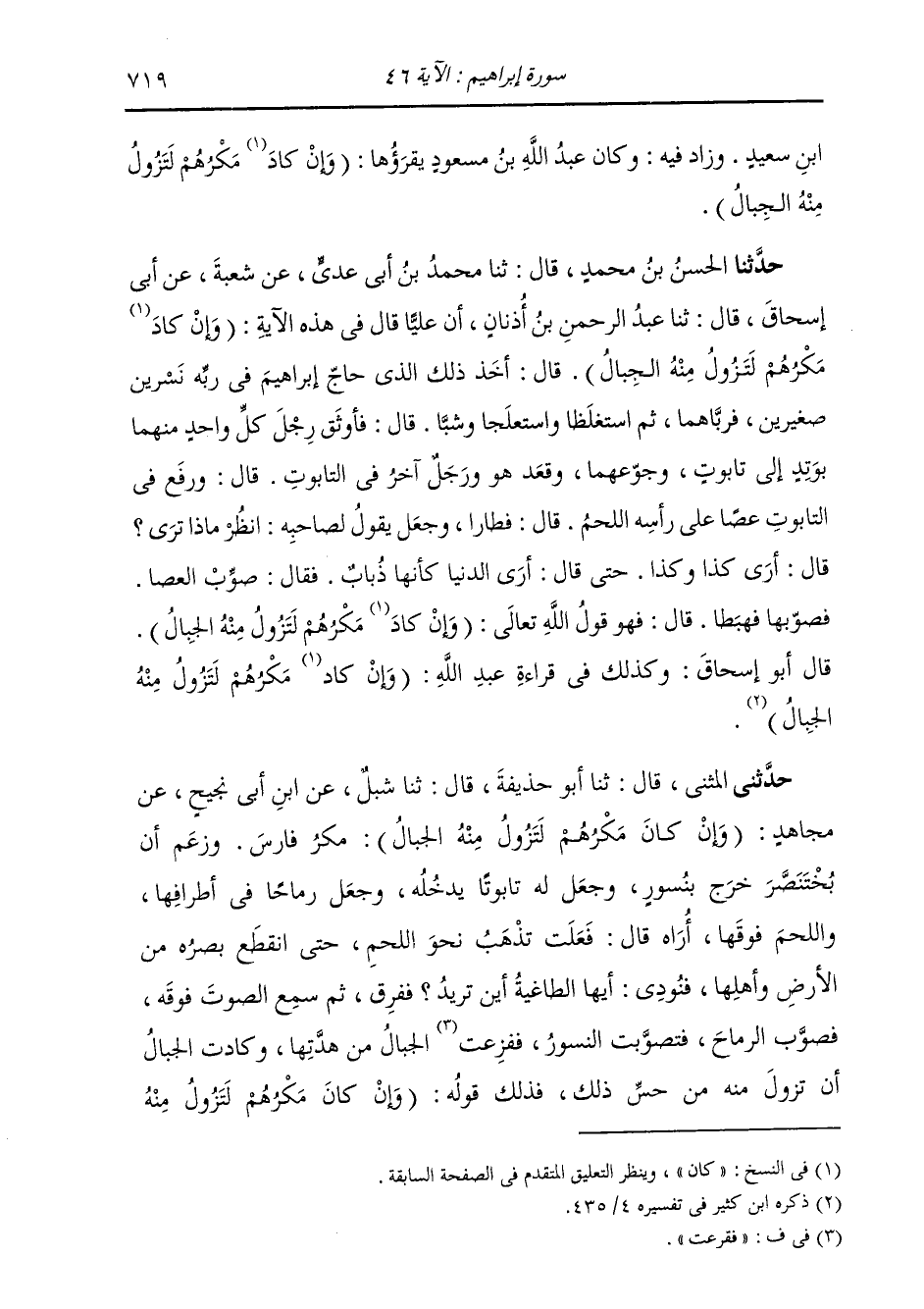 حَدَّثَنِي الْمُثَنَّى، قَالَ: ثنا أَبُو حُذَيْفَةَ، قَالَ: ثنا شِبْلٌ، عَنِ ابْنِ أَبِي نَجِيحٍ، عَنْ مُجَاهِدٍ: (§وَإِنْ كَانَ مَكْرُهُمْ لَتَزُولُ مِنْهُ الْجِبَالُ) ، مَكْرُ فَارِسَ، وَزَعَمَ أَنَّ بُخْتُنْصُرَ خَرَجَ بِنُسُورٍ، وَجَعَلَ لَهُ تَابُوتًا يَدْخُلُهُ، وَجَعَلَ رِمَاحًا فِي أَطْرَافِهَا وَاللَّحْمَ فَوْقَهَا أُرَاهُ قَالَ: فَعَلَتْ تَذْهَبُ نَحْوَ اللَّحْمِ حَتَّى انْقَطَعَ بَصَرُهُ مِنَ الْأَرْضِ وَأَهْلِهَا، فَنُودِيَ: أَيُّهَا الطَّاغِيَةُ، أَيْنَ تُرِيدُ؟ فَفَرِقَ، ثُمَّ سَمِعَ الصَّوْتَ فَوْقَهُ، فَصَوَّبَ الرِّمَاحَ، فَتَصَوَّبَتِ النُّسُورُ، فَفَزِعَتِ الْجِبَالُ مِنْ هِدَّتِهَا، وَكَادَتِ الْجِبَالُ أَنْ تَزُولَ مِنْهُ مِنْ حِسِّ ذَلِكَ، فَذَلِكَ قَوْلُهُ: (وَإِنْ كَانَ مَكْرُهُمْ لَتَزُولُ مِنْهُ -[720]- الْجِبَالُ) "