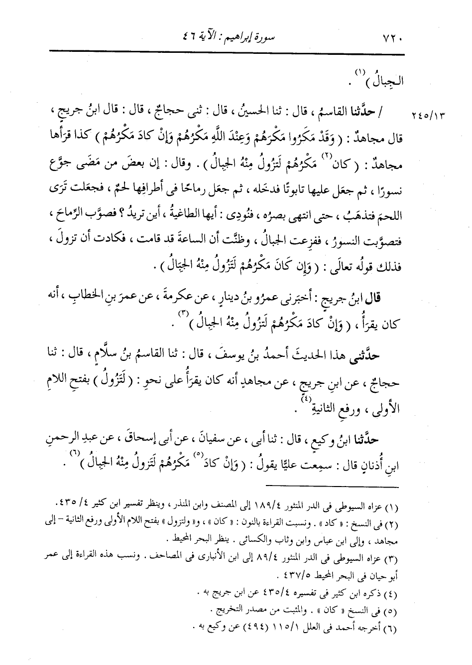 حَدَّثَنِي هَذَا الْحَدِيثَ أَحْمَدُ بْنُ يُوسُفَ قَالَ: ثنا الْقَاسِمُ بْنُ سَلَّامٍ، قَالَ: ثنا حَجَّاجٌ، عَنِ ابْنِ جُرَيْجٍ، عَنْ مُجَاهِدٍ، " §أَنَّهُ كَانَ يَقْرَأُ عَلَى نَحْوِ: (لَتَزُولُ) ، بِفَتْحِ اللَّامِ الْأُولَى وَرَفْعِ الثَّانِيَةِ "