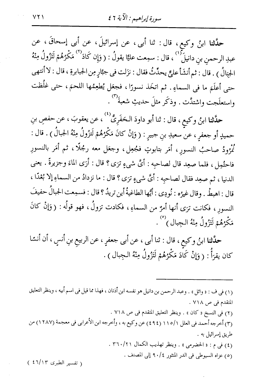 حَدَّثَنَا ابْنُ وَكِيعٍ، قَالَ: ثنا أَبِي، عَنْ أَبِي جَعْفَرٍ، عَنِ الرَّبِيعِ بْنِ أَنَسٍ، أَنَّ أَنَسًا §كَانَ يَقْرَأُ: (وَإِنْ كَادَ مَكْرُهُمْ لَتَزُولُ مِنْهُ الْجِبَالُ) ". -[722]- وَقَالَ آخَرُونَ: كَانَ مَكْرُهُمْ شِرْكُهُمْ بِاللَّهِ وَافْتِرَاءُهُمْ عَلَيْهِ