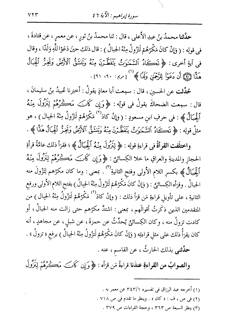 حُدِّثْتُ عَنِ الحُسَيْنِ قَالَ: سَمِعْتُ أَبَا مُعَاذٍ يَقُولُ: أَخْبَرَنَا عُبَيْدُ بْنُ سُلَيْمَانَ قَالَ: سَمِعْتُ الضَّحَّاكَ يَقُولُ فِي قَوْلِهِ: " {§وَإِنْ كَانَ مَكْرُهُمْ لِتَزُولَ مِنْهُ الْجِبَالُ} [إبراهيم: 46] فِي حَرْفِ ابْنِ مَسْعُودٍ: (وَإِنْ كَادَ مَكْرُهُمْ لَتَزُولُ مِنْهُ الْجِبَالُ) هُوَ مِثْلُ قَوْلِهِ: {تَكَادُ السَّمَوَاتُ يَتَفَطَّرْنَ مِنْهُ، وَتَنْشَقُّ الْأَرْضُ، وَتَخِرُّ الْجِبَالُ هَدًّا} " وَاخْتَلَفَتِ الْقُرَّاءُ فِي قِرَاءَةِ قَوْلِهِ: {لِتَزُولَ مِنْهُ الْجِبَالُ} [إبراهيم: 46] فَقَرَأَ ذَلِكَ عَامَّةُ قُرَّاءِ الْحِجَازِ وَالْمَدِينَةِ وَالْعِرَاقِ مَا خَلَا الْكَسَائِيَّ: {وَإِنْ كَانَ مَكْرُهُمْ لِتَزُولَ مِنْهُ الْجِبَالُ} [إبراهيم: 46] بِكَسْرِ اللَّامِ الْأُولَى وَفَتْحِ الثَّانِيَةِ، بِمَعْنَى: وَمَا كَانَ مَكْرُهُمْ لِتَزُولَ مِنْهُ الْجِبَالُ، وَقَرَأَهُ الْكَسَائِيُّ: (وَإِنْ كَانَ مَكْرُهُمْ لَتَزُولُ مِنْهُ الْجِبَالُ) بِفَتْحِ اللَّامِ الْأُولَى وَرَفْعِ الثَّانِيَةِ، عَلَى تَأْوِيلِ قِرَاءَةِ مَنْ قَرَأَ ذَلِكَ: (وَإِنْ كَادَ مَكْرُهُمْ لَتَزُولُ مِنْهُ الْجِبَالُ) مِنَ الْمُتَقَدِّمِينَ الَّذِينَ ذَكَرْتُ أَقْوَالَهُمْ، بِمَعْنَى: اشْتَدَّ مَكْرُهُمْ حَتَّى زَالَتْ مِنْهُ الْجِبَالُ، أَوْ كَادَتْ تَزُولُ مِنْهُ