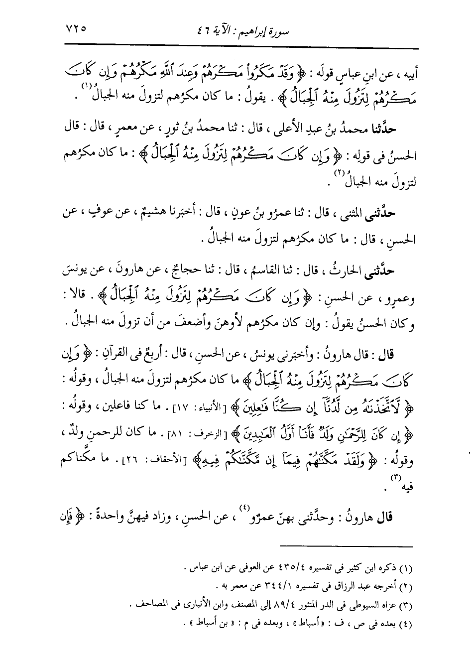 حَدَّثَنِي الْحَرْثُ قَالَ: ثنا الْقَاسِمُ قَالَ: ثنا حَجَّاجٌ، عَنْ هَارُونَ، عَنْ يُونُسَ وَعَمْرٍو، عَنِ الْحَسَنِ: {§وَإِنْ كَانَ مَكْرُهُمْ لِتَزُولَ مِنْهُ الْجِبَالُ} [إبراهيم: 46] قَالَا: وَكَانَ الْحَسَنُ يَقُولُ: «وَإِنْ كَانَ مَكْرُهُمْ لَأَوْهَنُ وَأَضْعَفُ مِنْ أَنْ تَزُولَ مِنْهُ الْجِبَالُ»
