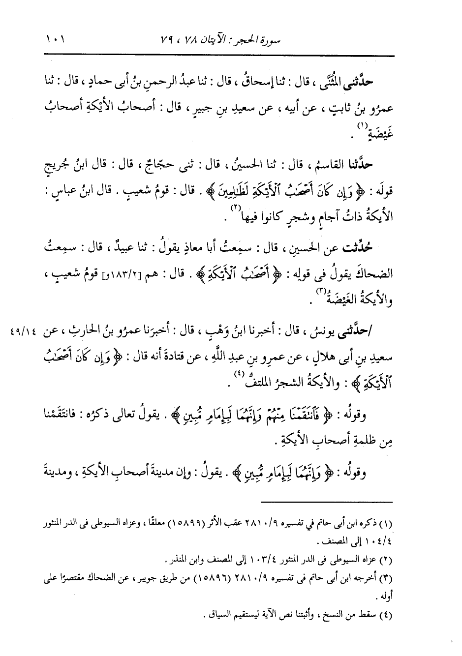 حَدَّثَنَا الْقَاسِمُ، قَالَ: ثنا الْحُسَيْنُ، قَالَ: ثني حَجَّاجٌ قَالَ: قَالَ ابْنُ جُرَيْجٍ، قَوْلُهُ: {§وَإِنْ كَانَ أَصْحَابُ الْأَيْكَةِ لَظَالِمِينَ} [الحجر: 78] قَالَ: «قَوْمُ شُعَيْبٍ»