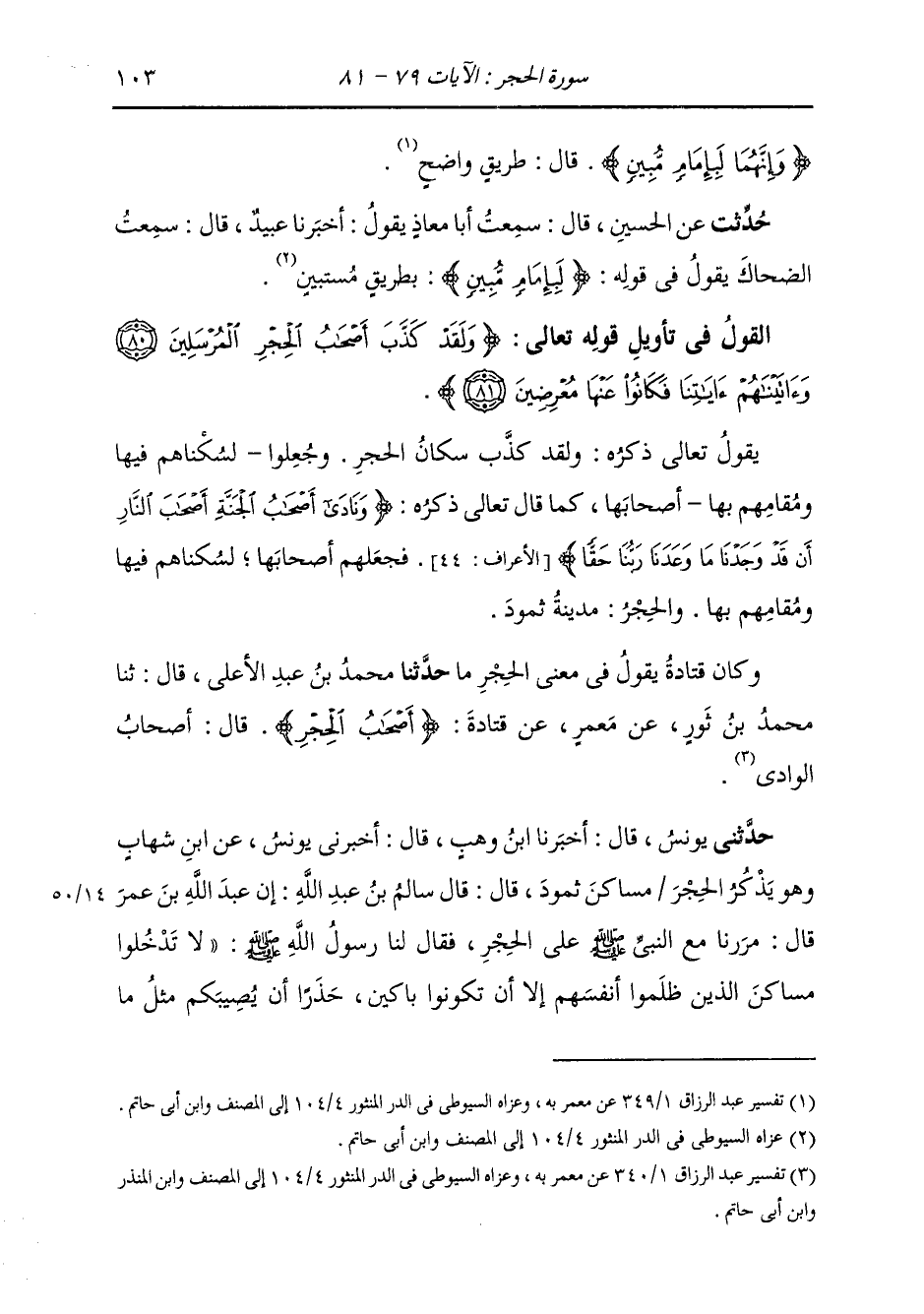 حَدَّثَنَا مُحَمَّدُ بْنُ عَبْدِ الْأَعْلَى، قَالَ: ثنا مُحَمَّدُ بْنُ ثَوْرٍ، عَنْ مَعْمَرٍ، عَنْ قَتَادَةَ: " §أَصْحَابُ الْحِجْرِ: قَالَ: أَصْحَابُ الْوَادِي "