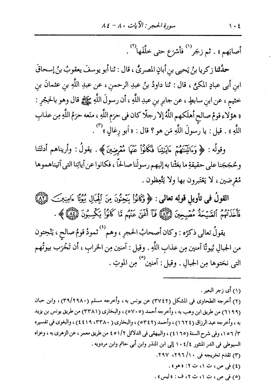 حَدَّثَنَا زَكَرِيَّا بْنُ يَحْيَى بْنِ أَبَانَ الْمِصْرِيُّ، قَالَ: ثنا أَبُو يُوسُفَ يَعْقُوبُ بْنُ إِسْحَاقَ بْنِ أَبِي عَبَّادٍ الْمَكِّيُّ قَالَ: ثنا دَاوُدُ بْنُ عَبْدِ الرَّحْمَنِ، عَنْ عَبْدِ اللَّهِ بْنِ عُثْمَانَ بْنِ خُثَيْمٍ، عَنِ ابْنِ سَابِطٍ، عَنْ جَابِرِ بْنِ عَبْدِ اللَّهِ: أَنَّ رَسُولَ اللَّهِ صَلَّى اللهُ عَلَيْهِ وَسَلَّمَ قَالَ وَهُوَ بِالْحِجْرِ: «§هَؤُلَاءِ قَوْمُ صَالِحٍ، أَهْلَكَهُمُ اللَّهُ إِلَّا رَجُلًا كَانَ فِي حَرَمِ اللَّهِ، مَنَعَهُ حَرَمُ اللَّهِ مِنْ عَذَابِ اللَّهِ» قِيلَ: يَا رَسُولَ اللَّهِ مَنْ هُوَ؟ قَالَ: «أَبُو رِغَالٍ»