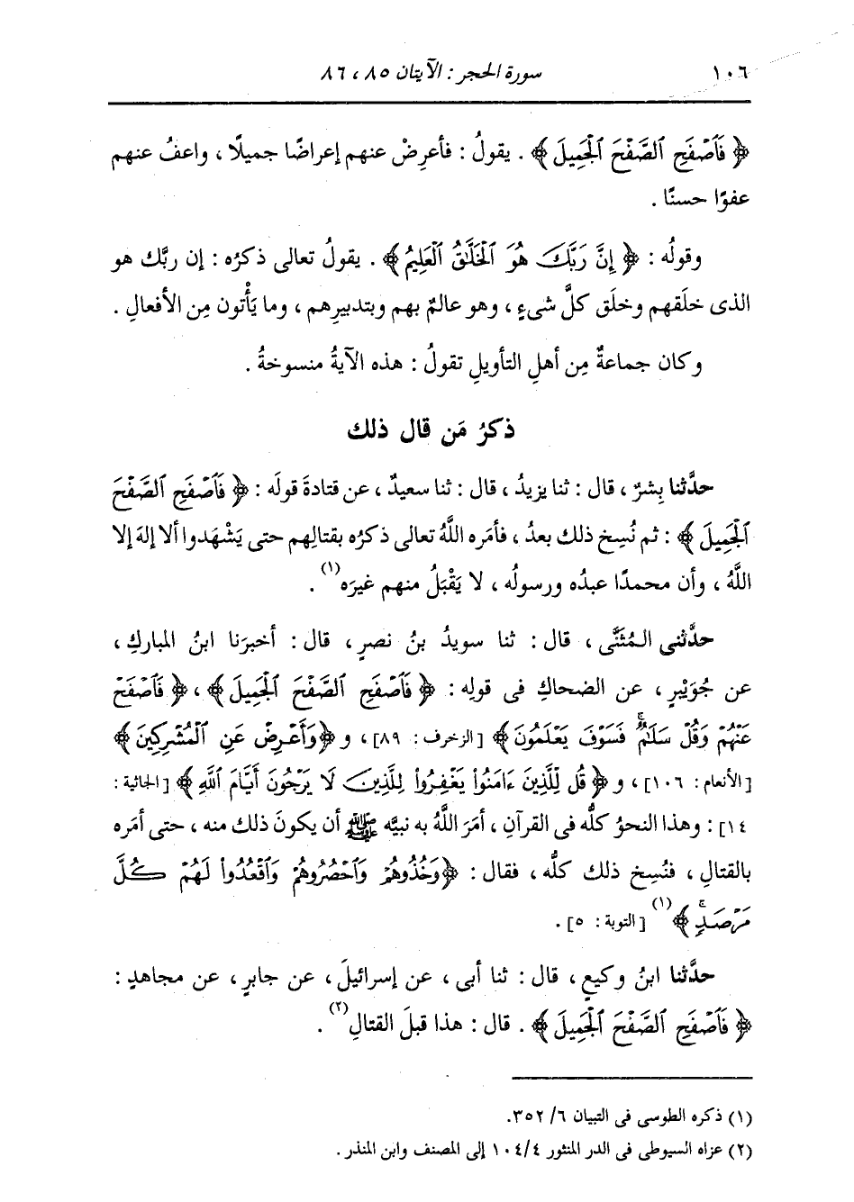 ذِكْرُ مَنْ قَالَ ذَلِكَ: حَدَّثَنَا بِشْرٌ، قَالَ: ثنا يَزِيدُ، قَالَ: ثنا سَعِيدٌ، عَنْ قَتَادَةَ، قَوْلُهُ: " {§فَاصْفَحِ الصَّفْحَ الْجَمِيلَ} [الحجر: 85] ثُمَّ نَسْخَ ذَلِكَ بَعْدُ، فَأَمَرَهُ اللَّهُ تَعَالَى ذِكْرُهُ بِقِتَالِهِمْ حَتَّى يَشْهَدُوا أَنْ لَا إِلَهَ إِلَّا اللَّهُ، وَأَنَّ مُحَمَّدًا عَبْدُهُ وَرَسُولُهُ، لَا يَقْبَلُ مِنْهُمْ غَيْرَهُ "