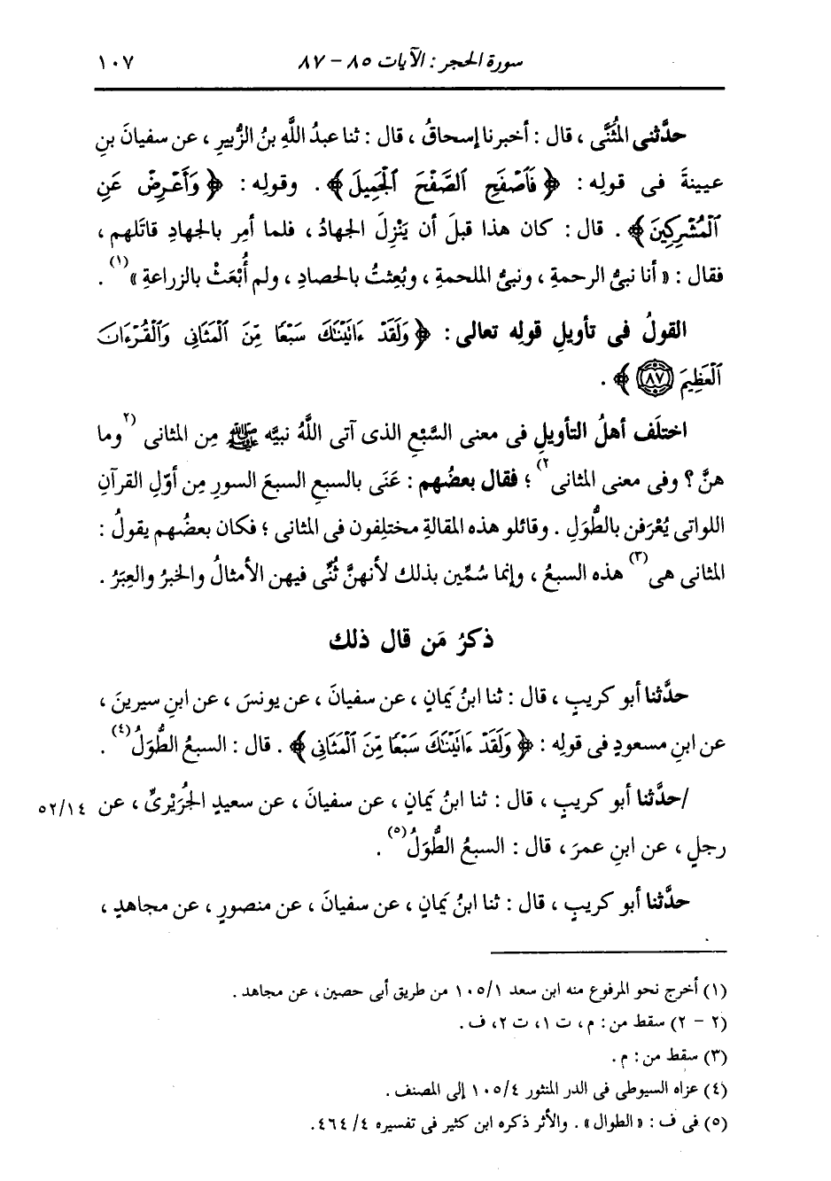 §الْقَوْلُ فِي تَأْوِيلِ قَوْلِهِ تَعَالَى: {وَلَقَدْ آتَيْنَاكَ سَبْعًا مِنَ الْمَثَانِي وَالْقُرْآنَ الْعَظِيمَ} [الحجر: 87] اخْتَلَفَ أَهْلُ التَّأْوِيلِ فِي مَعْنَى السَّبْعِ الَّذِي أَتَى اللَّهُ نَبِيَّهُ صَلَّى اللهُ عَلَيْهِ وَسَلَّمَ مِنَ الْمَثَانِي، فَقَالَ بَعْضُهُمْ عُنِيَ بِالسَّبْعِ: السَّبْعُ السُّوَرُ مِنْ أَوَّلِ الْقُرْآنِ اللَّوَاتِي يُعْرَفْنَ بِالطُّوَلِ. وَقَائِلُو هَذِهِ الْمَقَالَةِ مُخْتَلِفُونَ فِي الْمَثَانِي، فَكَانَ بَعْضُهُمْ يَقُولُ: الْمَثَانِي هَذِهِ السَّبْعُ، وَإِنَّمَا سُمِّينَ بِذَلِكَ لِأَنَّهُنَّ ثُنِّيَ فِيهِنَّ الْأَمْثَالُ وَالْخَبَرُ وَالْعِبَرُ