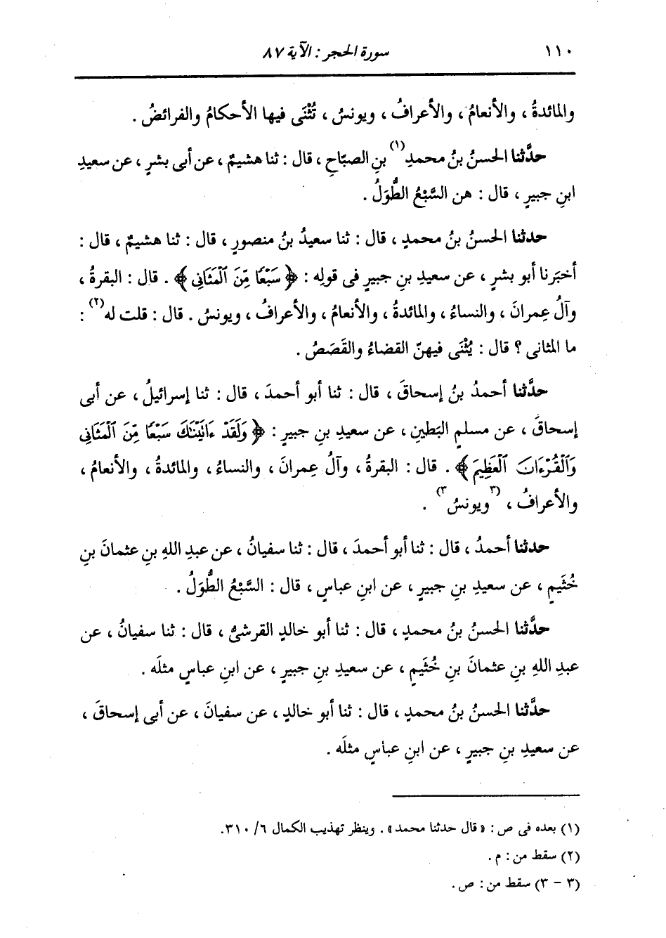 حَدَّثَنَا الْحَسَنُ بْنُ مُحَمَّدٍ قَالَ: ثنا سَعِيدُ بْنُ مَنْصُورٍ قَالَ: ثنا هُشَيْمٌ قَالَ: أَخْبَرَنَا أَبُو بِشْرٍ، عَنْ سَعِيدِ بْنِ جُبَيْرٍ، فِي قَوْلِهِ: {§سَبْعًا مِنَ الْمَثَانِي} [الحجر: 87] قَالَ: «الْبَقَرَةُ، وَآلُ عِمْرَانَ، وَالنِّسَاءُ، وَالْمَائِدَةُ، وَالْأَنْعَامُ، وَالْأَعْرَافُ، وَيُونُسُ» قَالَ: قُلْتُ: مَا الْمَثَانِي؟ قَالَ: يُثْنَى فِيهِنَّ الْقَضَاءُ وَالْقَصَصُ "