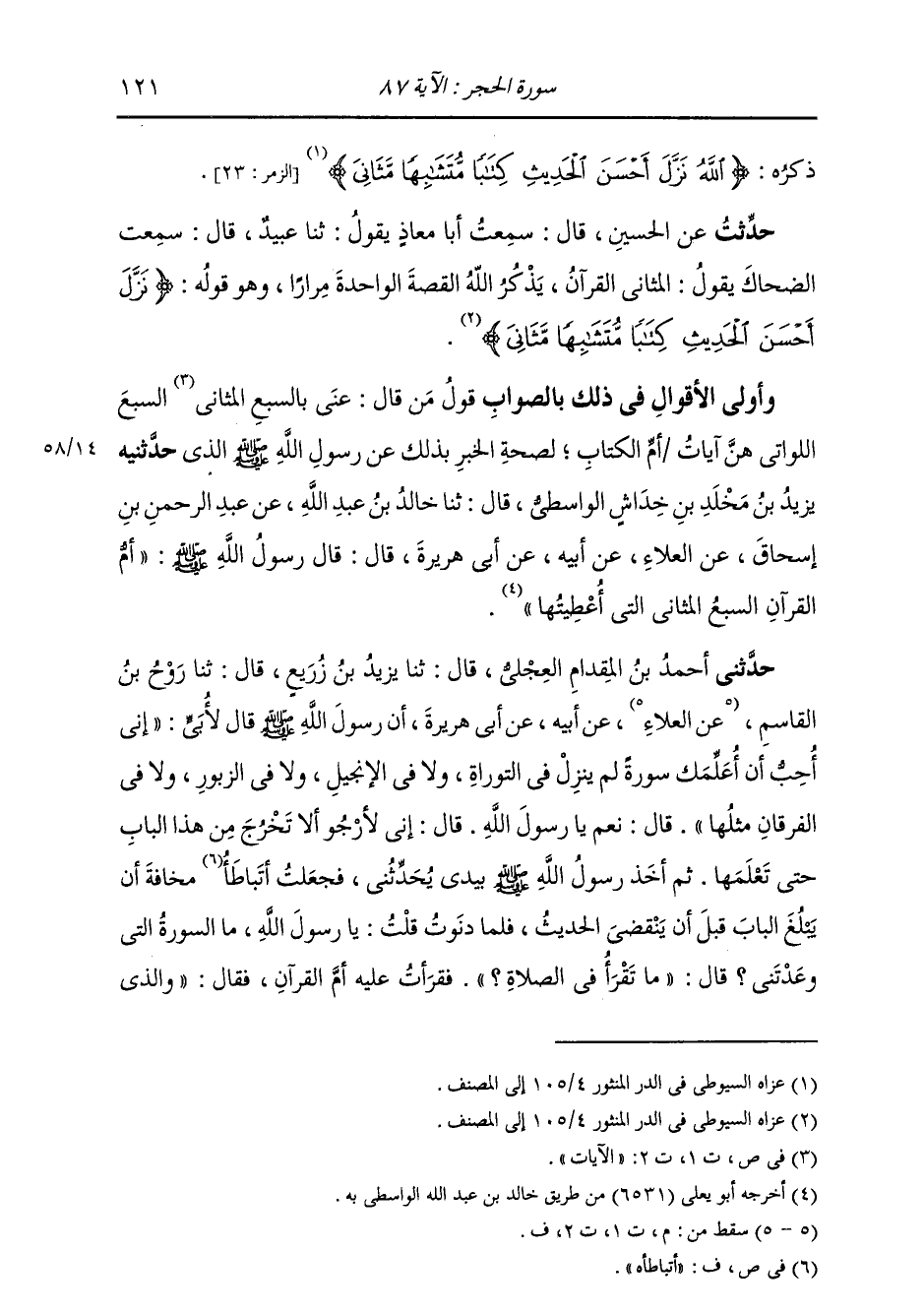 حُدِّثْتُ عَنِ الْحُسَيْنِ، قَالَ: سَمِعْتُ أَبَا مُعَاذٍ، يَقُولُ: ثنا عُبَيْدٌ، قَالَ: سَمِعْتُ الضَّحَّاكَ، يَقُولُ: " §الْمَثَانِي: الْقُرْآنُ، يَذْكُرُ اللَّهُ الْقِصَّةَ الْوَاحِدَةَ مِرَارًا، وَهُوَ قَوْلُهُ: {نَزَّلَ أَحْسَنَ الْحَدِيثِ كِتَابًا مُتَشَابِهًا مَثَانِيَ} [الزمر: 23] " وَأَوْلَى الْأَقْوَالِ فِي ذَلِكَ بِالصَّوَابِ قَوْلُ مَنْ قَالَ: عُنِيَ بِالسَّبْعِ الْمَثَانِي السَّبْعُ اللَّوَاتِي هُنَّ آيَاتُ أُمِّ الْكِتَابِ، لِصِحَّةِ الْخَبَرِ بِذَلِكَ عَنْ رَسُولِ اللَّهِ صَلَّى اللهُ عَلَيْهِ وَسَلَّمَ، الَّذِي: