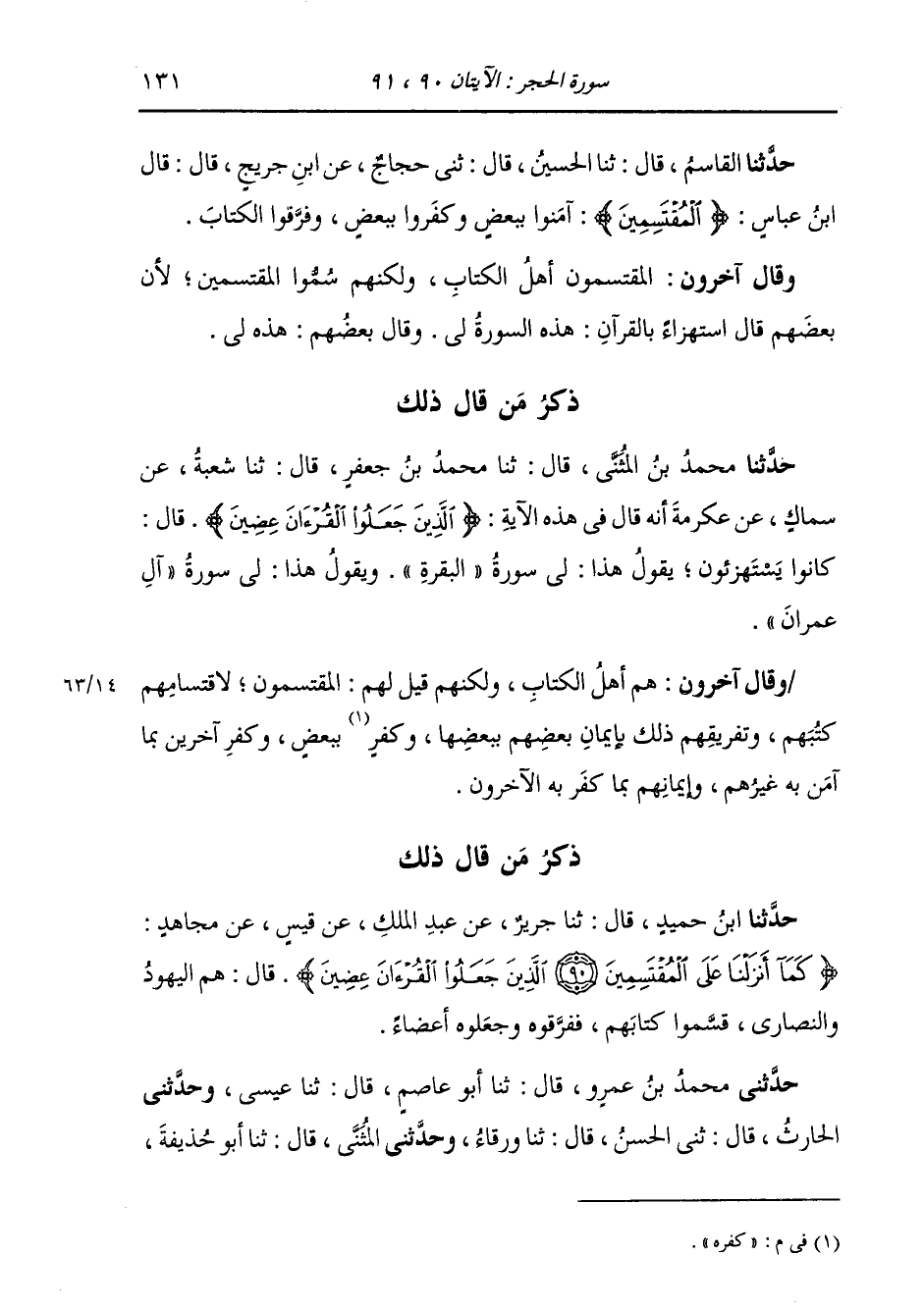 حَدَّثَنِي مُحَمَّدُ بْنُ عَمْرٍو، قَالَ: ثنا أَبُو عَاصِمٍ، قَالَ: ثنا عِيسَى، وَحَدَّثَنِي الْحَارِثُ، قَالَ: ثني الْحَسَنُ قَالَ: ثنا وَرْقَاءُ، وَحَدَّثَنِي الْمُثَنَّى، قَالَ: ثنا أَبُو حُذَيْفَةَ، -[132]- قَالَ: ثنا شِبْلٌ، جَمِيعًا، عَنِ ابْنِ أَبِي نَجِيحٍ، عَنْ مُجَاهِدٍ: {§كَمَا أَنْزَلْنَا عَلَى الْمُقْتَسِمِينَ} [الحجر: 90] قَالَ: «أَهْلُ الْكِتَابِ فَرَّقُوهُ وَبَدَّلُوهُ»