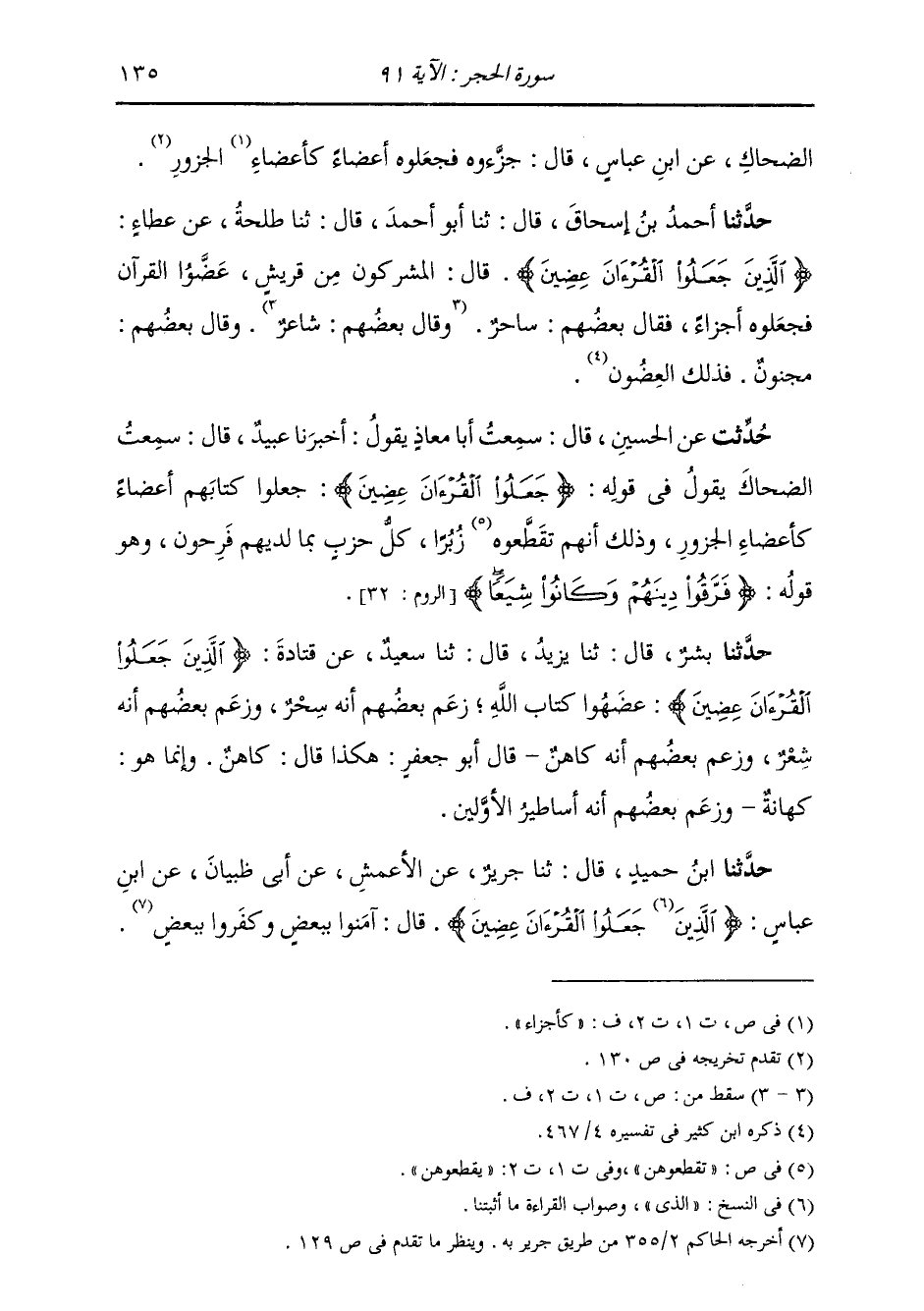 حَدَّثَنَا ابْنُ حُمَيْدٍ قَالَ: ثنا جَرِيرٌ، عَنِ الْأَعْمَشِ، عَنْ أَبِي ظَبْيَانَ، عَنِ ابْنِ عَبَّاسٍ: {" §الَّذِينَ جَعَلُوا الْقُرْآنَ عِضِينَ} [الحجر: 91] قَالَ: «آمَنُوا بِبَعْضٍ، وَكَفَرُوا بِبَعْضٍ»