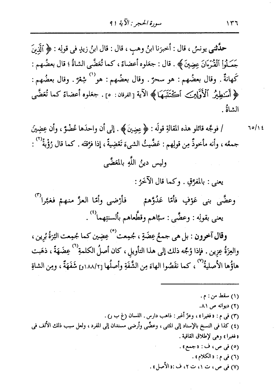 حَدَّثَنِي يُونُسُ، قَالَ: أَخْبَرَنِي ابْنُ وَهْبٍ، قَالَ: قَالَ ابْنُ زَيْدٍ، فِي قَوْلِهِ: {§الَّذِينَ جَعَلُوا الْقُرْآنَ عِضِينَ} [الحجر: 91] قَالَ: " جَعَلُوهُ أَعْضَاءَ كَمَا تُعَضَّى الشَّاةُ، قَالَ بَعْضُهُمْ: كَهَانَةٌ، وَقَالَ بَعْضُهُمْ: هُوَ سِحْرٌ، وَقَالَ بَعْضُهُمْ: شِعْرٌ، وَقَالَ بَعْضُهُمْ {أَسَاطِيرُ الْأَوَّلِينَ اكْتَتَبَهَا} [الفرقان: 5] الْآيَةَ، جَعَلُوهُ أَعْضَاءَ كَمَا تَعَضَّى الشَّاةُ ". فَوَجَّهَ قَائِلُو هَذِهِ الْمَقَالَةِ قَوْلَهُ: {عِضِينَ} [الحجر: 91] إِلَى أَنَّ وَاحِدَهَا: عُضْوٌ، وَأَنَّ عِضِينَ جَمْعُهُ، وَأَنَّهُ مَأْخُوذٌ مِنْ قَوْلِهِمْ عَضَّيْتُ الشَّيْءَ تَعْضِيَةً: إِذَا فَرَّقْتَهُ، كَمَا قَالَ رُؤْبَةُ: