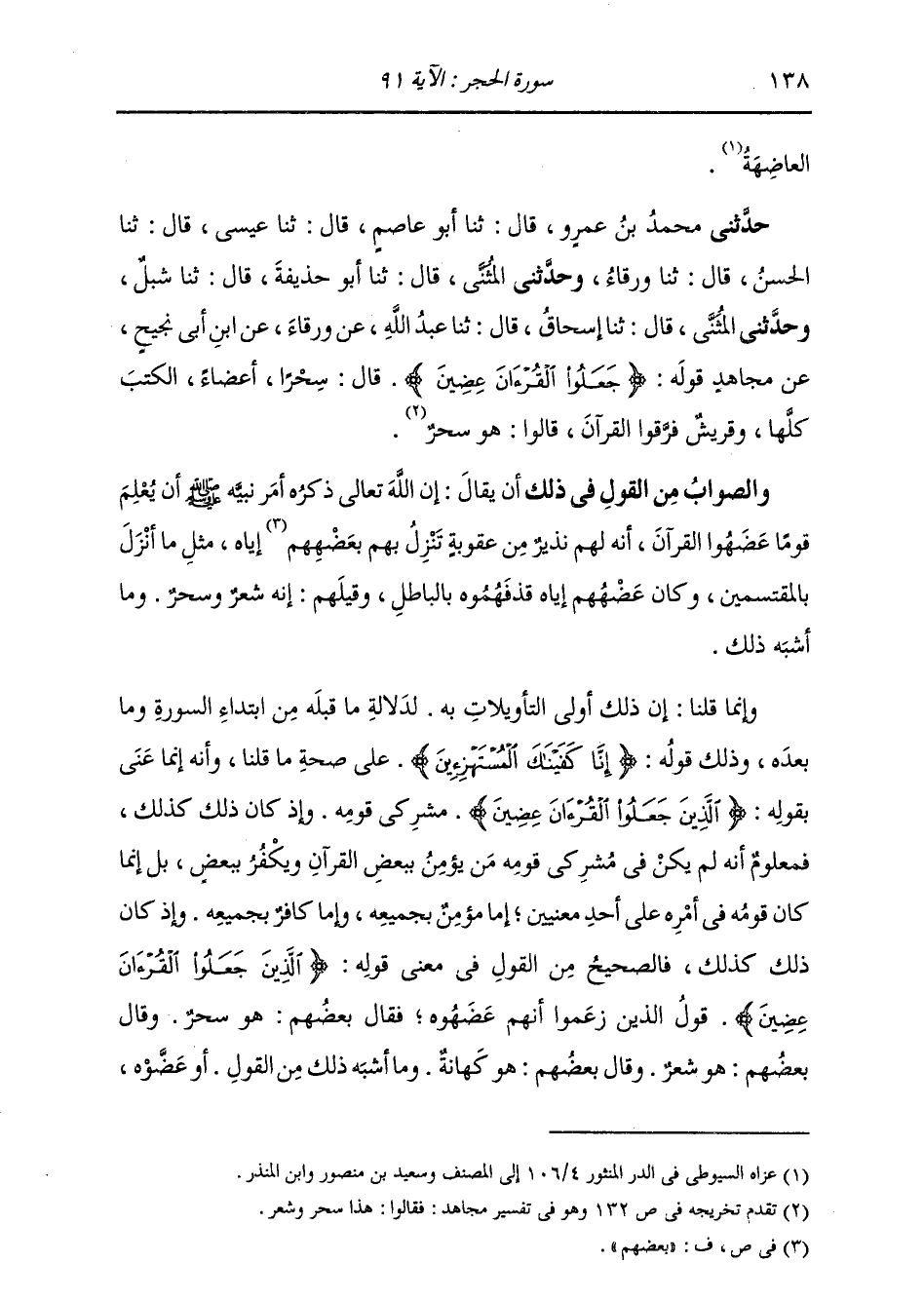 حَدَّثَنِي مُحَمَّدُ بْنُ عَمْرٍو، قَالَ: ثنا أَبُو عَاصِمٍ، قَالَ: ثنا عِيسَى، قَالَ: ثنا الْحَسَنُ، قَالَ: ثنا وَرْقَاءُ، وَحَدَّثَنِي الْمُثَنَّى، قَالَ: ثنا أَبُو حُذَيْفَةَ، قَالَ: ثنا شِبْلٌ، وَحَدَّثَنِي الْمُثَنَّى، قَالَ: ثنا إِسْحَاقُ، قَالَ: ثنا عَبْدُ اللَّهِ، عَنْ وَرْقَاءَ، عَنِ ابْنِ أَبِي نَجِيحٍ، عَنْ مُجَاهِدٍ، قَوْلُهُ: " {§جَعَلُوا الْقُرْآنَ عِضِينَ} [الحجر: 91] قَالَ: " سِحْرًا، أَعْضَاءُ الْكُتُبِ كُلِّهَا، وَقُرَيْشٌ فَرَّقُوا الْقُرْآنَ، قَالُوا: هُوَ سِحْرٌ " وَالصَّوَابُ مِنَ الْقَوْلِ فِي ذَلِكَ أَنْ يُقَالَ: إِنَّ اللَّهَ تَعَالَى ذِكْرُهُ أَمَرَ نَبِيَّهُ صَلَّى اللهُ عَلَيْهِ وَسَلَّمَ أَنْ يُعْلِمَ قَوْمًا عَضَّهُوا الْقُرْآنَ أَنَّهُ لَهُمْ نَذِيرٌ مِنْ عُقُوبَةٍ تَنْزِلُ بِهِمْ بِعَضْهِهِمْ إِيَّاهُ مِثْلَ مَا أَنْزَلَ بِالْمُقْتَسِمِينَ، وَكَانَ عَضْهُهُمْ إِيَّاهُ: قَذْفُهُمُوهُ بِالْبَاطِلِ، وَقِيلِهِمْ إِنَّهُ شِعْرٌ وَسِحْرٌ، وَمَا أَشْبَهَ ذَلِكَ. وَإِنَّمَا قُلْنَا إِنَّ ذَلِكَ أَوْلَى التَّأْوِيلَاتِ بِهِ لِدَلَالَةِ مَا قَبْلَهُ مِنَ ابْتِدَاءِ السُّورَةِ وَمَا بَعْدَهُ، وَذَلِكَ قَوْلُهُ: {إِنَّا كَفَيْنَاكَ الْمُسْتَهْزِئِينَ} [الحجر: 95] ، عَلَى صِحَّةِ مَا قُلْنَا، وَإِنَّهُ إِنَّمَا عُنِيَ بِقَوْلِهِ: {الَّذِينَ جَعَلُوا الْقُرْآنَ عِضِينَ} [الحجر: 91] مُشْرِكِي قَوْمِهِ وَإِذْ كَانَ ذَلِكَ كَذَلِكَ، فَمَعْلُومٌ أَنَّهُ لَمْ يَكُنْ فِي مُشْرِكِي قَوْمِهِ مَنْ يُؤْمِنُ بِبَعْضِ الْقُرْآنِ وَيَكْفُرُ بِبَعْضٍ، بَلْ إِنَّمَا كَانَ قَوْمُهُ فِي أَمْرِهِ عَلَى أَحَدِ مَعْنَيَيْنِ: إِمَّا مُؤْمِنٌ بِجَمِيعِهِ، وَإِمَّا كَافِرٌ بِجَمِيعِهِ وَإِذْ كَانَ ذَلِكَ كَذَلِكَ، فَالصَّحِيحُ مِنَ الْقَوْلِ فِي مَعْنَى قَوْلِهِ: {الَّذِينَ جَعَلُوا الْقُرْآنَ عِضِينَ} [الحجر: 91] قَوْلُ الَّذِينَ زَعَمُوا أَنَّهُمْ عَضَهُوهُ، فَقَالَ بَعْضُهُمْ: هُوَ سِحْرٌ، وَقَالَ بَعْضُهُمْ: هُوَ شِعْرٌ، وَقَالَ بَعْضُهُمْ: هُوَ كَهَانَةٌ، وَأَمَّا أَشْبَهُ ذَلِكَ مِنَ الْقَوْلِ، أَوْ عَضُّوهُ