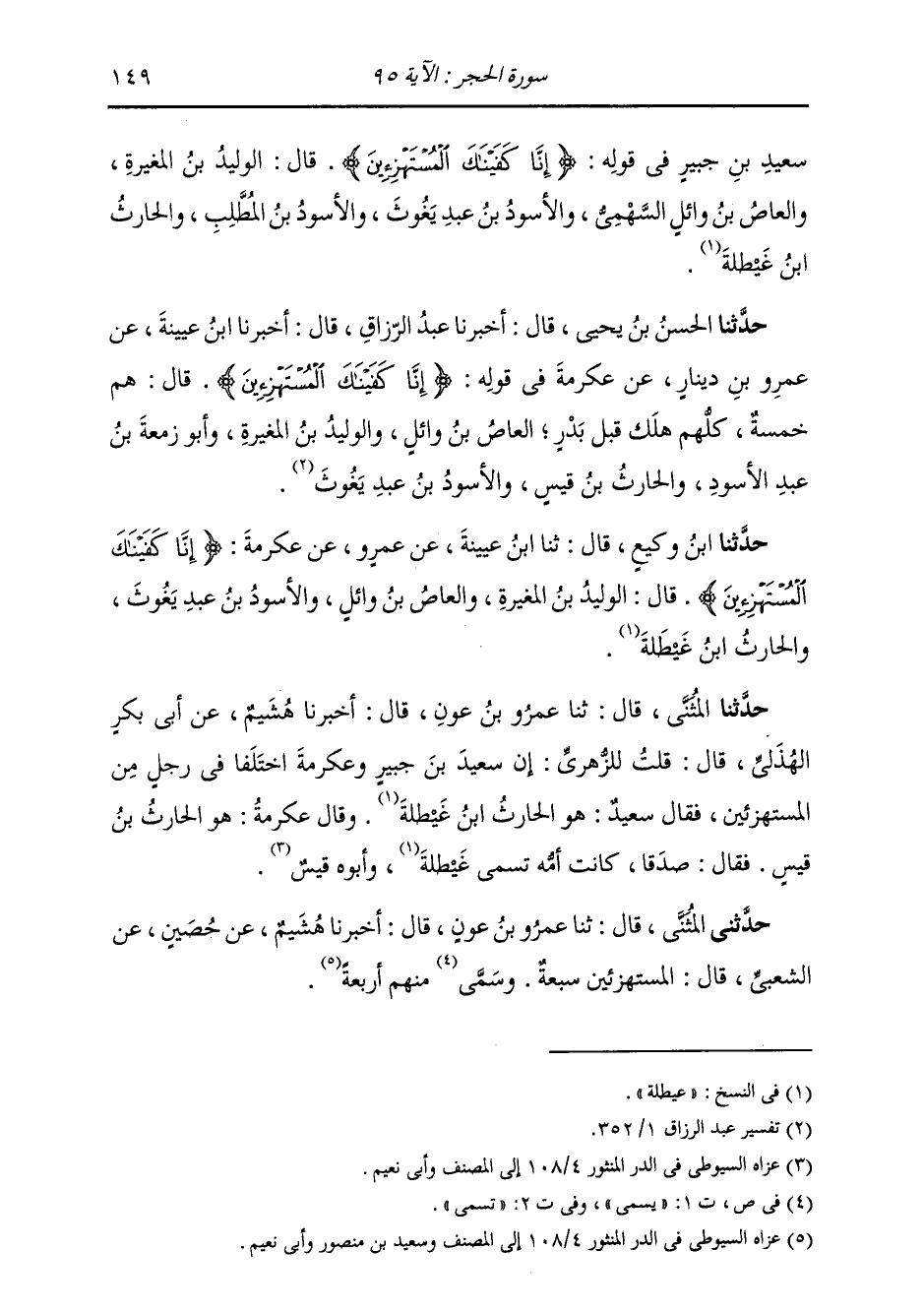 حَدَّثَنَا ابْنُ وَكِيعٍ قَالَ: ثنا ابْنُ عُيَيْنَةَ، عَنْ عَمْرٍو، عَنْ عِكْرِمَةَ: {§إِنَّا كَفَيْنَاكَ الْمُسْتَهْزِئِينَ} [الحجر: 95] قَالَ: «الْوَلِيدُ بْنُ الْمُغِيرَةِ، وَالْعَاصُ بْنُ وَائِلٍ، وَالْأَسْوَدُ بْنُ عَبْدِ يَغُوثَ، وَالْحَارِثُ بْنُ عَيْطَلَةَ»