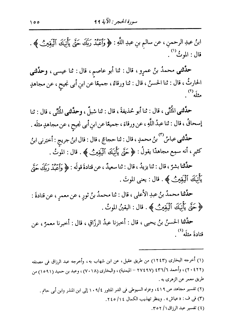 حَدَّثَنَا مُحَمَّدُ بْنُ عَبْدِ الْأَعْلَى قَالَ: ثنا مُحَمَّدُ بْنُ ثَوْرٍ، عَنْ مَعْمَرٍ، عَنْ قَتَادَةَ: " {§حَتَّى يَأْتِيَكَ الْيَقِينُ} [الحجر: 99] ، قَالَ: الْيَقِينُ: الْمَوْتُ ". حَدَّثَنَا الْحَسَنُ بْنُ يَحْيَى قَالَ: أَخْبَرَنَا عَبْدُ الرَّزَّاقِ قَالَ: أَخْبَرَنَا مَعْمَرٌ، عَنْ قَتَادَةَ، مِثْلَهُ