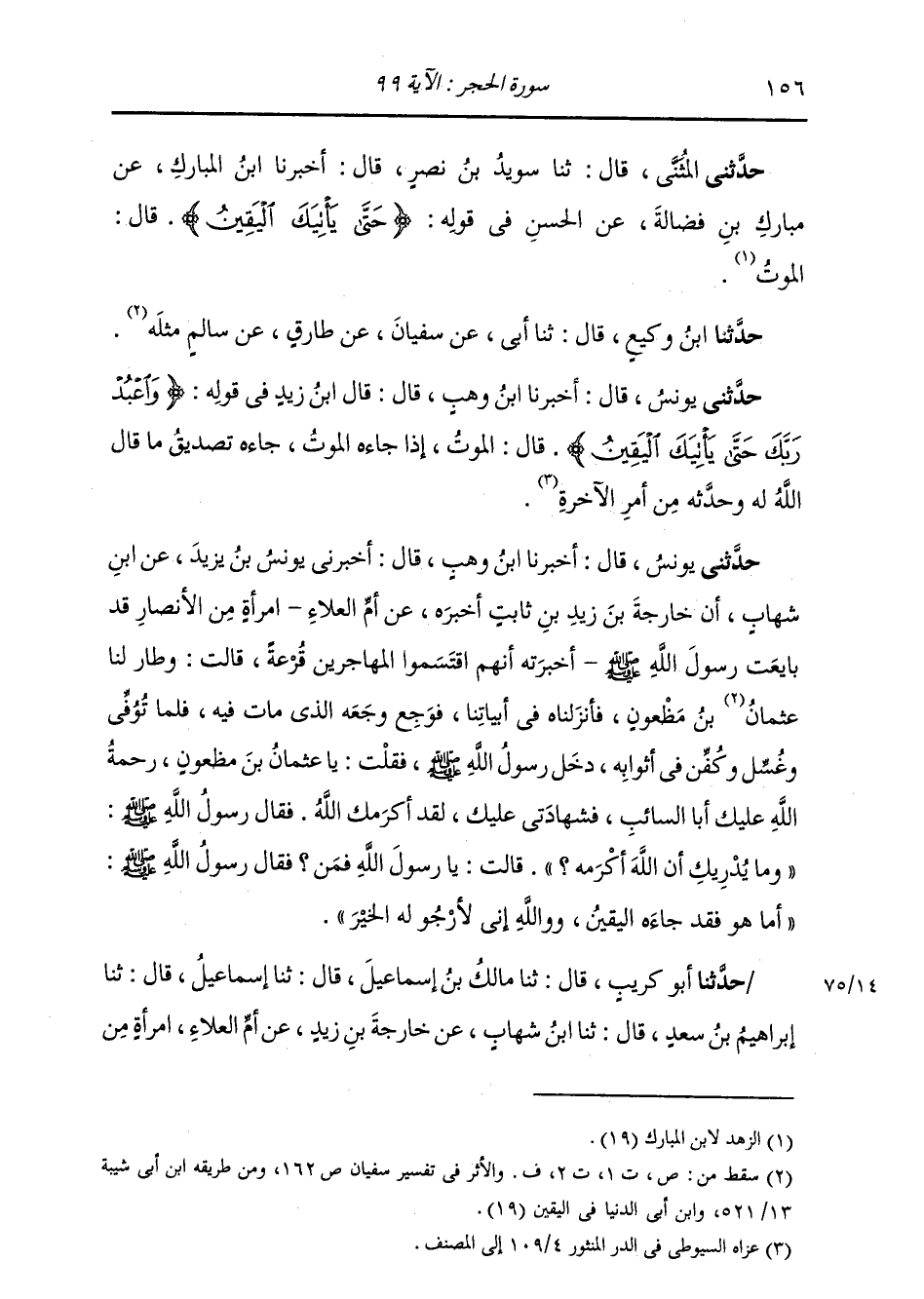 حَدَّثَنِي الْمُثَنَّى، قَالَ: ثنا سُوَيْدُ بْنُ نَصْرٍ، قَالَ: أَخْبَرَنَا ابْنُ الْمُبَارَكِ، عَنْ مُبَارَكِ بْنِ فَضَالَةَ، عَنِ الْحَسَنِ، فِي قَوْلِهِ: " {§حَتَّى يَأْتِيَكَ الْيَقِينُ} [الحجر: 99] ، قَالَ: الْمَوْتُ ". حَدَّثَنَا ابْنُ وَكِيعٍ قَالَ: ثنا أَبِي، عَنْ سُفْيَانَ، عَنْ طَارِقٍ، عَنْ سَالِمٍ، مِثْلَهُ