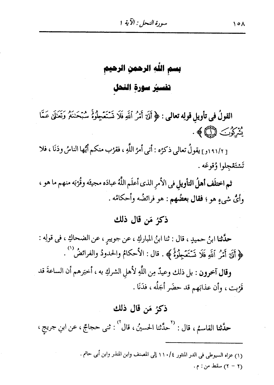 §الْقَوْلُ فِي تَأْوِيلِ قَوْلِهِ تَعَالَى: {أَتَى أَمْرُ اللَّهِ فَلَا تَسْتَعْجِلُوهُ، سُبْحَانَهُ وَتَعَالَى عَمَّا يُشْرِكُونَ} [النحل: 1] يَقُولُ تَعَالَى ذِكْرُهُ: أَتَى أَمْرُ اللَّهِ فَقَرُبَ مِنْكُمْ أَيُّهَا النَّاسُ وَدَنَا، فَلَا تَسْتَعْجِلُوا وقُوعَهُ ثُمَّ اخْتَلَفَ أَهْلُ التَّأْوِيلِ فِي الْأَمْرِ الَّذِي أَعْلَمَ اللَّهُ عِبَادَهُ مَجِيئَهُ وَقُرْبَهُ مِنْهُمْ مَا هُوَ، وَأَيُّ شَيْءٍ هُوَ؟ فَقَالَ بَعْضُهُمْ: هُوَ فَرَائِضُهُ وَأَحْكَامُهُ