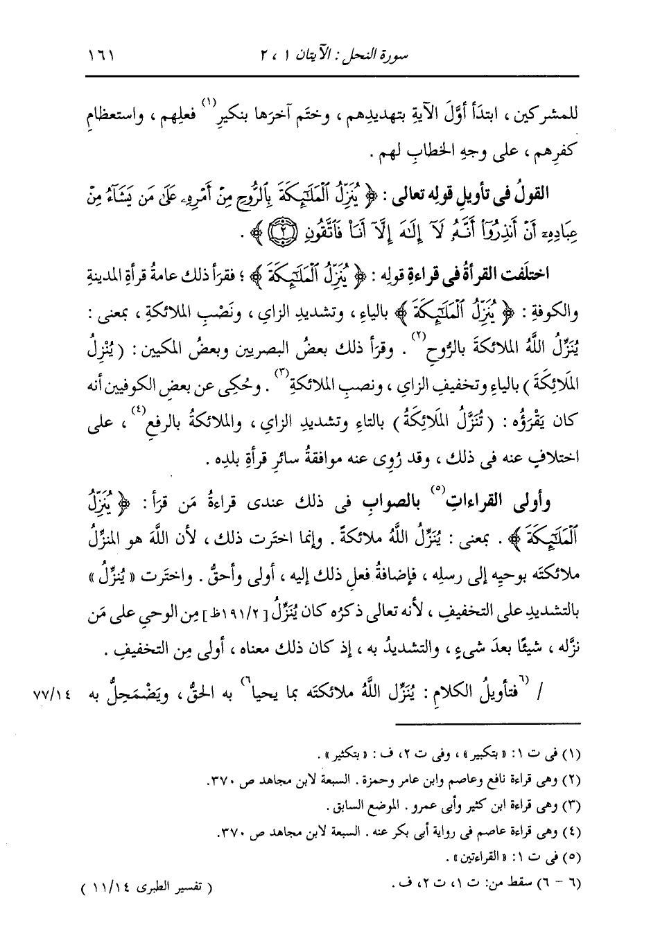 §الْقَوْلُ فِي تَأْوِيلِ قَوْلِهِ تَعَالَى: {يُنَزِّلُ الْمَلَائِكَةَ بِالرُّوحِ مِنْ أَمْرِهِ عَلَى مَنْ يَشَاءُ مِنْ عِبَادِهِ أَنْ أَنْذِرُوا أَنَّهُ لَا إِلَهَ إِلَّا أَنَا فَاتَّقُونِ} [النحل: 2] اخْتَلَفَتِ الْقُرَّاءُ فِي قِرَاءَةِ قَوْلِهِ: {يُنَزِّلُ الْمَلَائِكَةَ} [النحل: 2] فَقَرَأَ ذَلِكَ عَامَّةُ قُرَّاءِ الْمَدِينَةِ وَالْكُوفَةِ: {يُنَزِّلُ الْمَلَائِكَةَ} [النحل: 2] بِالْيَاءِ وَتَشْدِيدِ الزَّايِ وَنَصْبِ الْمَلَائِكَةِ، بِمَعْنَى يُنَزِّلُ اللَّهُ الْمَلَائِكَةَ بِالرُّوحِ وَقَرَأَ ذَلِكَ بَعْضُ الْبَصْرِيِّينَ وَبَعْضُ الْمَكِّيِّينَ: (يُنْزِلُ الْمَلَائِكَةَ) بِالْيَاءِ وَتَخْفِيفِ الزَّايِ وَنَصْبِ الْمَلَائِكَةِ، وَحُكِيَ عَنْ بَعْضِ الْكُوفِيِّينَ أَنَّهُ كَانَ يَقْرَؤُهُ: (تَنَزَّلُ الْمَلَائِكَةَ) ، بِالتَّاءِ وَتَشْدِيدِ الزَّايِ وَالْمَلَائِكَةِ بِالرَّفْعِ، عَلَى اخْتِلَافٍ عَنْهُ فِي ذَلِكَ وَقَدْ رُوِيَ عَنْهُ مُوَافَقَةُ سَائِرِ قُرَّاءِ بَلَدِهِ. وَأَوْلَى الْقِرَاءَاتِ بِالصَّوَابِ فِي ذَلِكَ عِنْدِي قِرَاءَةُ مَنْ قَرَأَ: {يُنَزِّلُ الْمَلَائِكَةَ} [النحل: 2] بِمَعْنَى: يُنَزِّلُ اللَّهُ مَلَائِكَةً، وَإِنَّمَا اخْتَرْتُ ذَلِكَ، لِأَنَّ اللَّهَ هُوَ الْمُنَزِّلُ مَلَائِكَتَهُ بِوَحْيِهِ إِلَى رُسُلِهِ، فَإِضَافَةُ فِعْلِ ذَلِكَ إِلَيْهِ أَوْلَى وَأَحَقُّ وَاخْتَرْتُ «يُنَزِّلُ» بِالتَّشْدِيدِ عَلَى التَّخْفِيفِ، لِأَنَّهُ تَعَالَى ذِكْرُهُ كَانَ يُنَزِّلُ مِنَ الْوَحْيِ عَلَى مَنْ نَزَّلَهُ شَيْئًا بَعْدَ شَيْءٍ، وَالتَّشْدِيدُ بِهِ إِذْ كَانَ ذَلِكَ مَعْنَاهُ أَوْلَى مِنَ التَّخْفِيفِ. فَتَأْوِيلُ الْكَلَامِ: يُنَزِّلُ اللَّهُ مَلَائِكَتَهُ بِمَا يَحْيَا بِهِ الْحَقُّ وَيَضْمَحِلُّ بِهِ