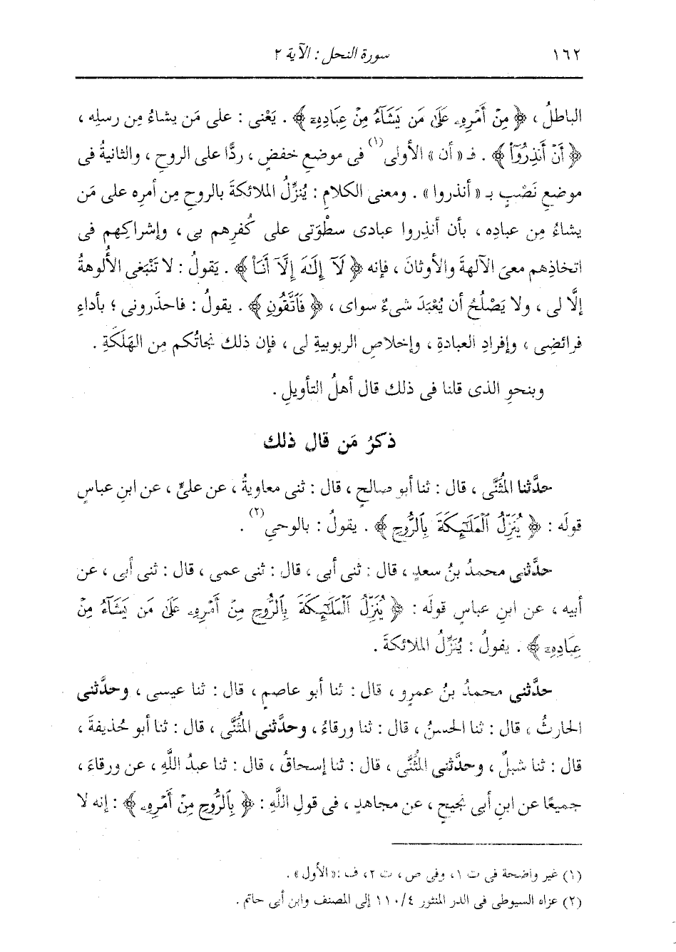 ذِكْرُ مَنْ قَالَ ذَلِكَ: حَدَّثَنَا الْمُثَنَّى، قَالَ: ثنا أَبُو صَالِحٍ، قَالَ: ثني مُعَاوِيَةُ، عَنْ عَلِيٍّ، عَنِ ابْنِ عَبَّاسٍ، قَوْلُهُ: " {§يُنَزِّلُ الْمَلَائِكَةَ بِالرُّوحِ} [النحل: 2] يَقُولُ: بِالْوَحْيِ "