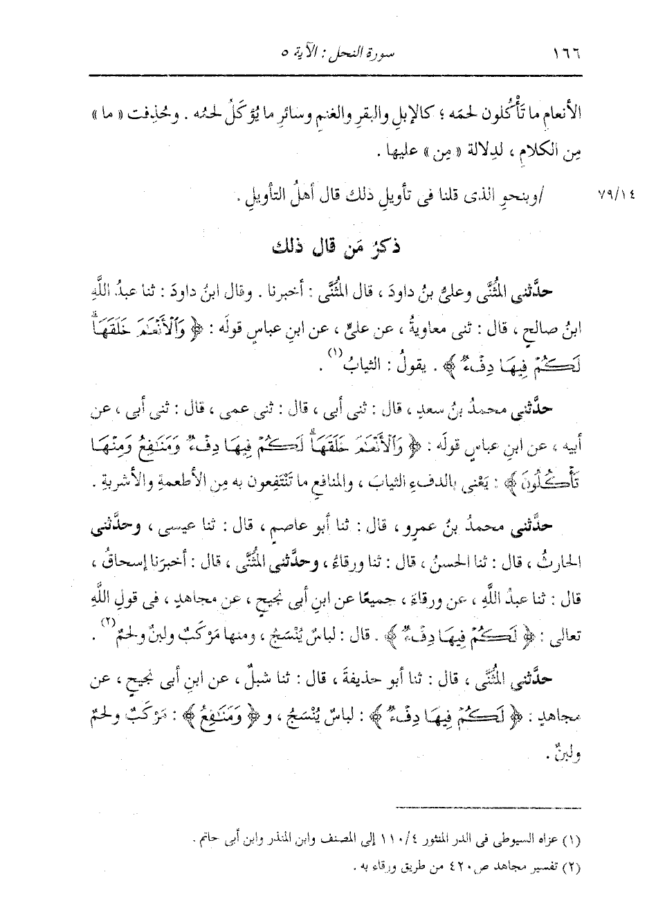 حَدَّثَنَا مُحَمَّدُ بْنُ عَمْرٍو، قَالَ: ثنا أَبُو عَاصِمٍ، قَالَ: ثنا عِيسَى، وَحَدَّثَنِي الْحَرْثُ، قَالَ: ثنا الْحَسَنُ، قَالَ: ثنا وَرْقَاءُ، وَحَدَّثَنِي الْمُثَنَّى، قَالَ: أَخْبَرَنَا إِسْحَاقُ، قَالَ: ثنا عَبْدُ اللَّهِ، عَنْ وَرْقَاءَ، جَمِيعًا، عَنِ ابْنِ أَبِي نَجِيحٍ، عَنْ مُجَاهِدٍ، فِي قَوْلِ اللَّهِ تَعَالَى: {§لَكُمْ فِيهَا دِفْءٌ} [النحل: 5] قَالَ: «لِبَاسٌ يُنْسَجُ، وَمِنْهَا مَرْكَبٌ، وَلَبَنٌ، وَلَحْمٌ»