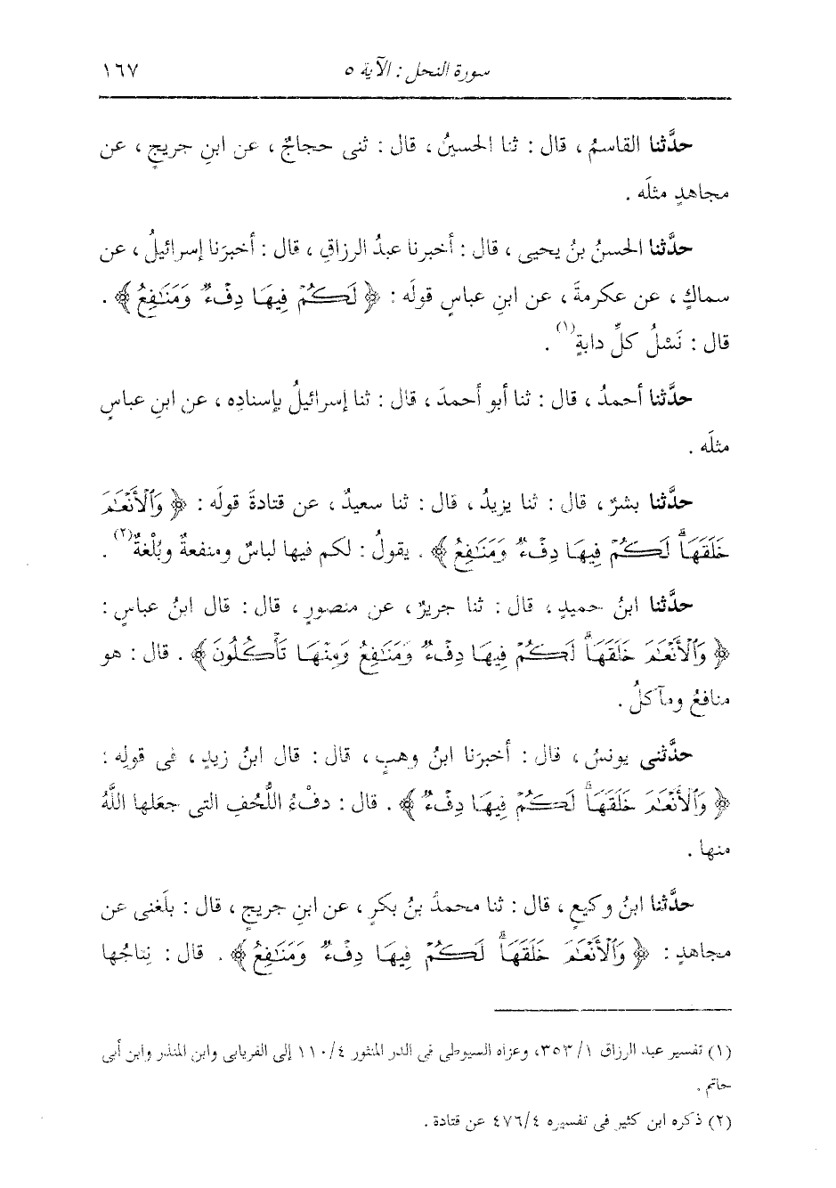 حَدَّثَنَا الْحَسَنُ بْنُ يَحْيَى، قَالَ: أَخْبَرَنَا عَبْدُ الرَّزَّاقِ، قَالَ: أَخْبَرَنَا إِسْرَائِيلُ، عَنْ سِمَاكٍ، عَنْ عِكْرِمَةَ، عَنِ ابْنِ عَبَّاسٍ، قَوْلُهُ: {§لَكُمْ فِيهَا دِفْءٌ وَمَنَافِعُ} [النحل: 5] قَالَ: «نَسْلُ كُلِّ دَابَّةٍ» . حَدَّثَنَا أَحْمَدُ قَالَ: ثنا أَبُو أَحْمَدَ قَالَ: ثنا إِسْرَائِيلُ بِإِسْنَادِهِ، عَنِ ابْنِ عَبَّاسٍ، مِثْلَهُ