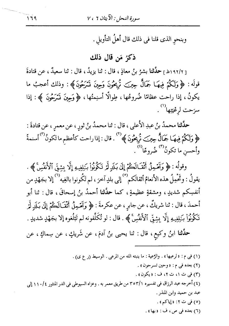 حَدَّثَنَا مُحَمَّدُ بْنُ عَبْدِ الْأَعْلَى قَالَ: ثنا مُحَمَّدُ بْنُ ثَوْرٍ، عَنْ مَعْمَرٍ، عَنْ قَتَادَةَ: {§وَلَكُمْ فِيهَا جَمَالٌ حِينَ تُرِيحُونَ وَحِينَ تَسْرَحُونَ} [النحل: 6] قَالَ: «إِذَا رَاحَتْ كَأَعْظَمِ مَا تَكُونُ أَسْنِمَةً، وَأَحْسَنِ مَا تَكُونُ ضُرُوعًا»