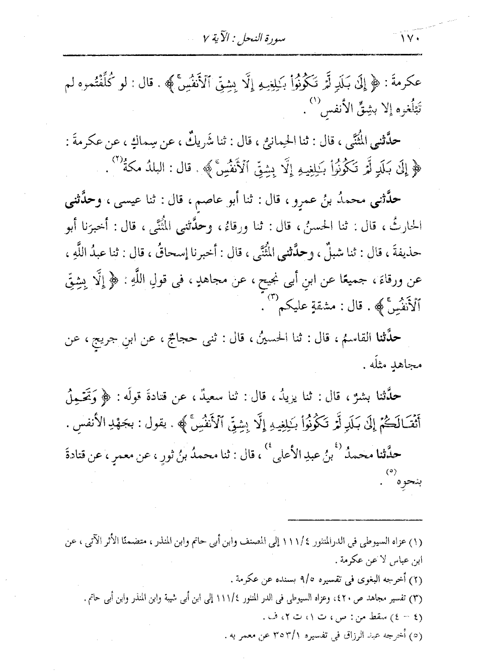 حَدَّثَنِي مُحَمَّدُ بْنُ عَمْرٍو، قَالَ: ثنا أَبُو عَاصِمٍ، قَالَ: ثنا عِيسَى، وَحَدَّثَنِي الْحَرْثُ، قَالَ: ثنا الْحَسَنُ، قَالَ: ثنا وَرْقَاءُ، وَحَدَّثَنِي الْمُثَنَّى، قَالَ: أَخْبَرَنَا أَبُو حُذَيْفَةَ، قَالَ: ثنا شِبْلٌ، وَحَدَّثَنِي الْمُثَنَّى، قَالَ: أَخْبَرَنَا إِسْحَاقُ، قَالَ: ثنا عَبْدُ اللَّهِ، عَنْ وَرْقَاءَ، جَمِيعًا، عَنِ ابْنِ أَبِي نَجِيحٍ، عَنْ مُجَاهِدٍ، فِي قَوْلِ اللَّهِ: {§إِلَّا بِشِقِّ الْأَنْفُسِ} [النحل: 7] قَالَ: «مَشَقَّةٌ عَلَيْكُمْ» . حَدَّثَنَا الْقَاسِمُ قَالَ: ثنا الْحُسَيْنُ قَالَ: ثني حَجَّاجٌ، عَنِ ابْنِ جُرَيْجٍ، عَنْ مُجَاهِدٍ، مِثْلَهُ "