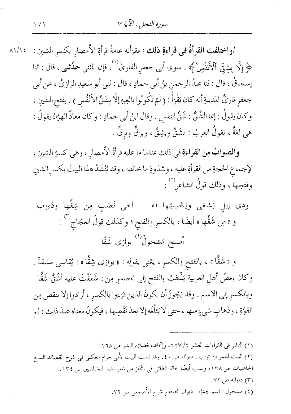 الْمُثَنَّى حَدَّثَنِي قَالَ: ثنا إِسْحَاقُ، قَالَ: ثنا عَبْدُ الرَّحْمَنِ بْنُ أَبِي حَمَّادٍ، قَالَ: ثني أَبُو سَعِيدٍ الرَّازِيُّ، عَنْ أَبِي جَعْفَرٍ قَارِئِ الْمَدِينَةِ أَنَّهُ " §كَانَ يَقْرَأُ: (لَمْ تَكُونُوا بَالِغِيهِ إِلَّا بِشَقِّ الْأَنْفُسِ) بِفَتْحِ الشِّينِ، وَكَانَ يَقُولُ: إِنَّمَا الشَّقُّ: شَقُّ النَّفْسِ ". وَقَالَ ابْنُ أَبِي حَمَّادٍ: وَكَانَ مُعَاذٌ الْهَرَّاءُ يَقُولُ: هِيَ لُغَةٌ، تَقُولُ الْعَرَبُ بِشِقٍّ وَبِشَقٍّ، وَبِرِقٍّ وَبَرَقٍّ وَالصَّوَابُ مِنَ الْقِرَاءَةِ فِي ذَلِكَ عِنْدَنَا مَا عَلَيْهِ قُرَّاءُ الْأَمْصَارِ وَهِيَ كَسْرُ الشِّينِ، لِإِجْمَاعِ الْحُجَّةِ مِنَ الْقُرَّاءِ عَلَيْهِ وَشُذُوذِ مَا خَالَفَهُ، وَقَدْ يُنْشَدُ هَذَا الْبَيْتُ بِكَسْرِ الشِّينِ وَفَتْحِهَا، وَذَلِكَ قَوْلُ الشَّاعِرِ: