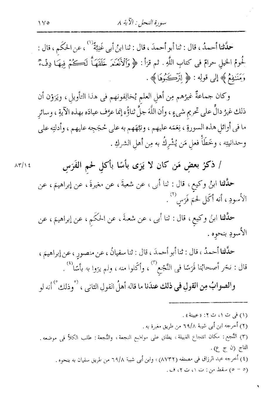 حَدَّثَنَا أَحْمَدُ، قَالَ: ثنا أَبُو أَحْمَدَ، قَالَ: ثنا ابْنُ أَبِي غَنِيَّةَ، عَنِ الْحَكَمِ، قَالَ: " §لُحُومُ الْخَيْلِ حَرَامٌ فِي كِتَابِ اللَّهِ، ثُمَّ قَرَأَ: {وَالْأَنْعَامَ خَلَقَهَا لَكُمْ فِيهَا دِفْءٌ وَمَنَافِعُ} [النحل: 5] إِلَى قَوْلِهِ: {لِتَرْكَبُوهَا} [النحل: 8] " وَكَانَ جَمَاعَةٌ غَيْرُهُمْ مِنْ أَهْلِ الْعِلْمِ يُخَالِفُونَهُمْ فِي هَذَا التَّأْوِيلِ، وَيَرَوْنَ أَنَّ ذَلِكَ غَيْرُ دَالٍّ عَلَى تَحْرِيمِ شَيْءٍ، وَأَنَّ اللَّهَ جَلَّ ثَنَاؤُهُ إِنَّمَا عَرَّفَ عِبَادَهُ بِهَذِهِ الْآيَةِ وَسَائِرِ مَا فِي أَوَائِلِ هَذِهِ السُّورَةِ نِعَمَهُ عَلَيْهِمْ، وَنَبَّهَهُمْ بِهِ عَلَى حُجَجِهِ عَلَيْهِمْ، وَأَدِلَّتِهِ عَلَى وَحْدَانِيَّتِهِ، وَخَطَأِ فِعْلِ مَنْ يُشْرِكُ بِهِ مِنْ أَهْلِ الشِّرْكِ 0 ذِكْرُ بَعْضِ مَنْ كَانَ لَا يَرَى بَأْسًا بِأَكْلِ لَحْمِ الْفَرَسِ