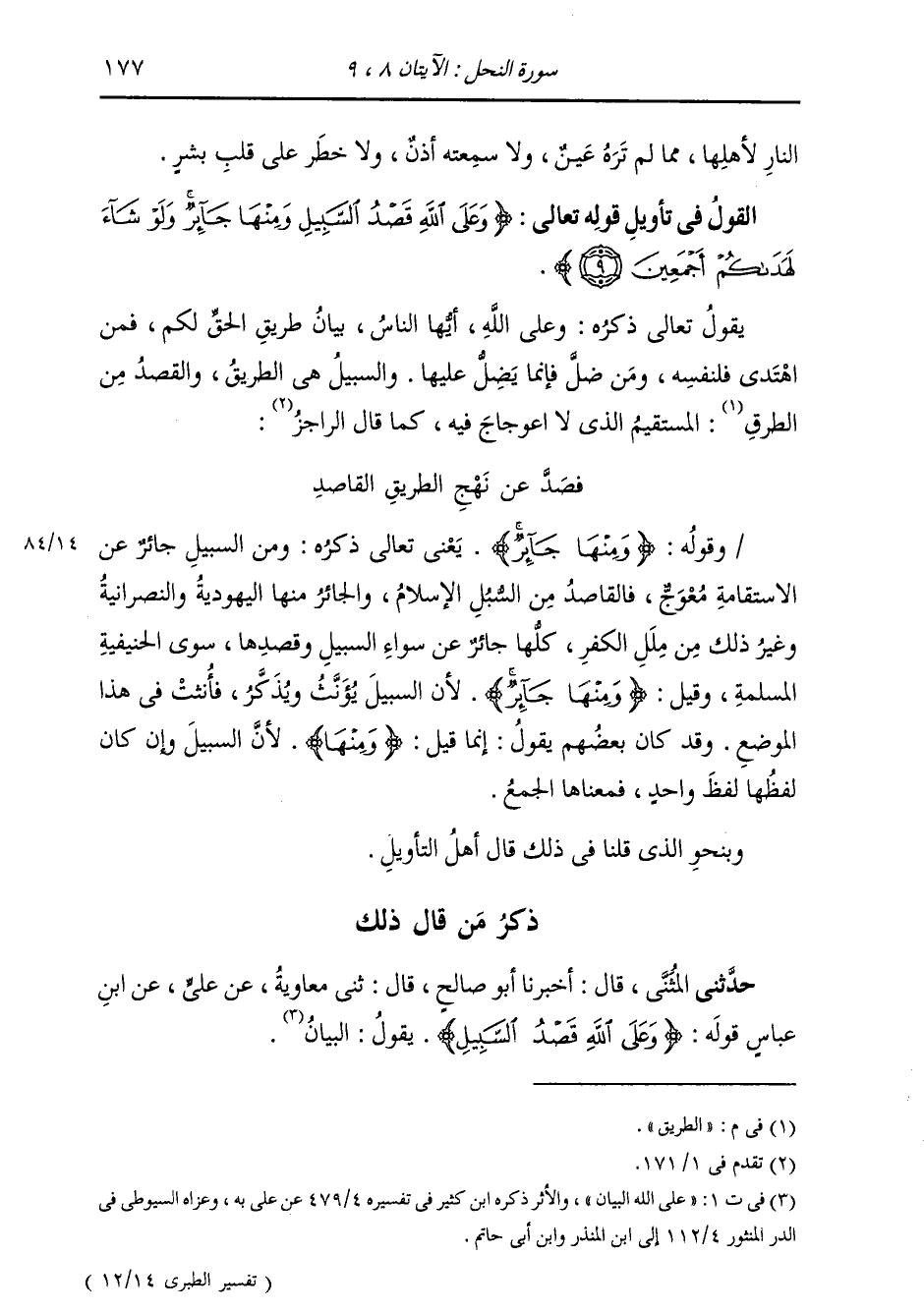 ذِكْرُ مَنْ قَالَ ذَلِكَ: حَدَّثَنِي الْمُثَنَّى، قَالَ: أَخْبَرَنَا أَبُو صَالِحٍ، قَالَ: ثني مُعَاوِيَةُ، عَنْ عَلِيٍّ، عَنِ ابْنِ عَبَّاسٍ، قَوْلُهُ: " {§وَعَلَى اللَّهِ قَصْدُ السَّبِيلِ} [النحل: 9] يَقُولُ: الْبَيَانُ "
